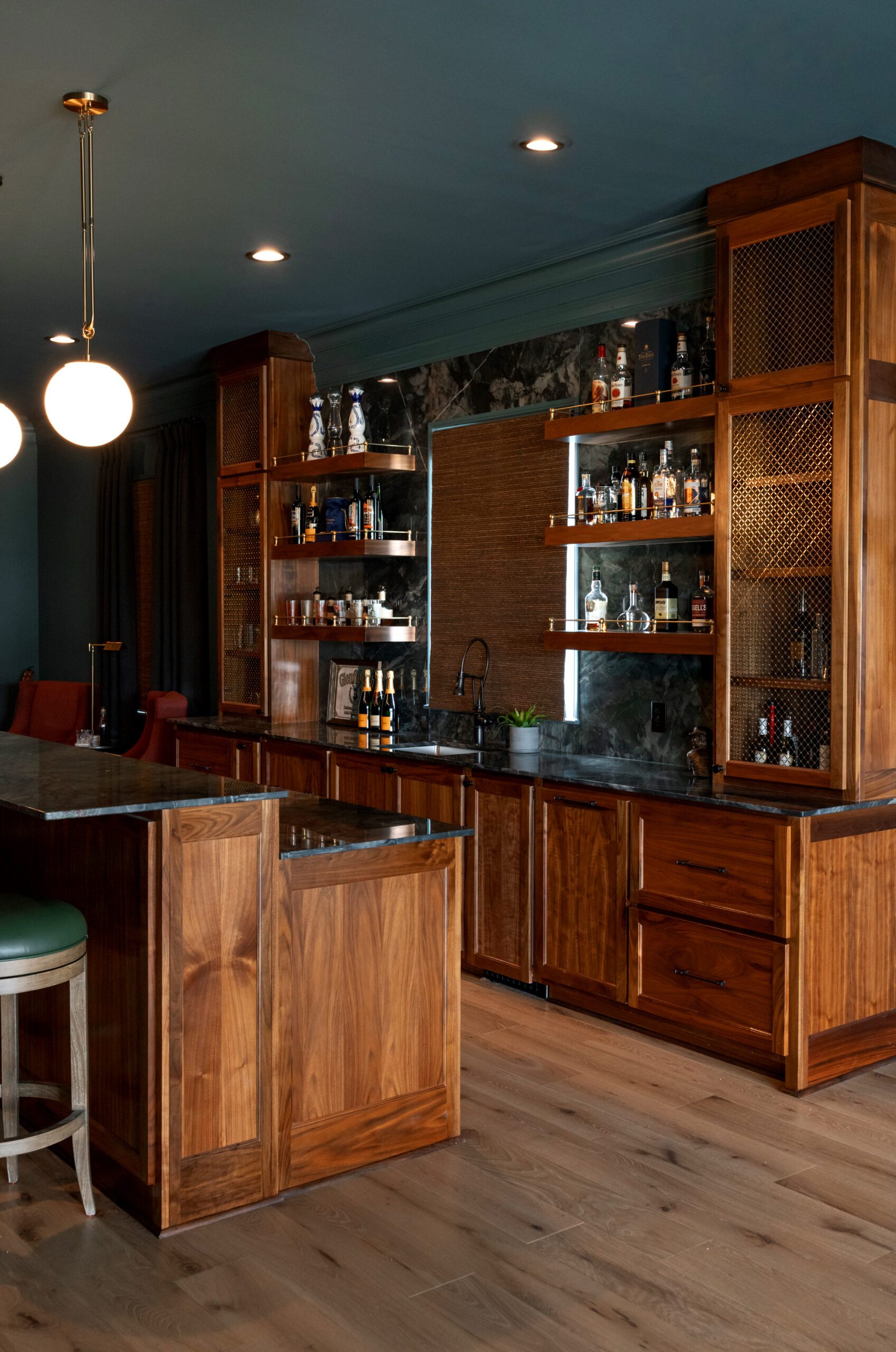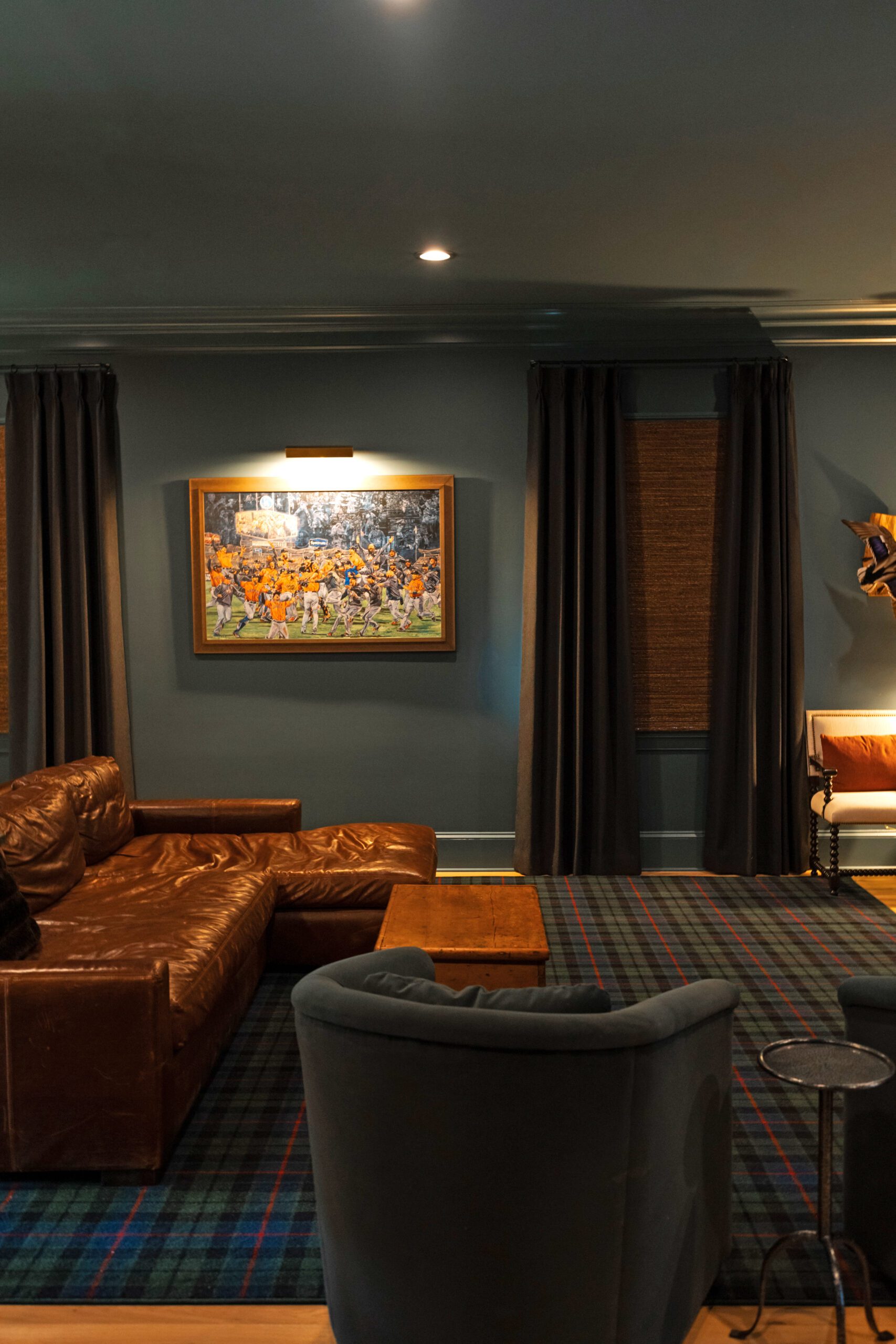 Instead of wall-to-wall tartan underfoot, Laura placed a plaid rug beneath the leather sectional sofa. She fulfilled Will’s request for green leather barstools at the bar and added classic elements like walnut cabinetry and touches of brass. The walls and ceiling are painted in Sherwin Williams’ “Still Water.”