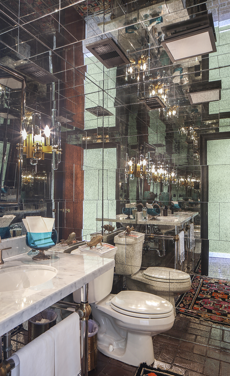 The powder room in the home of Mike and Lexie Polito features wallpaper designed by artist Ashley Longshore.