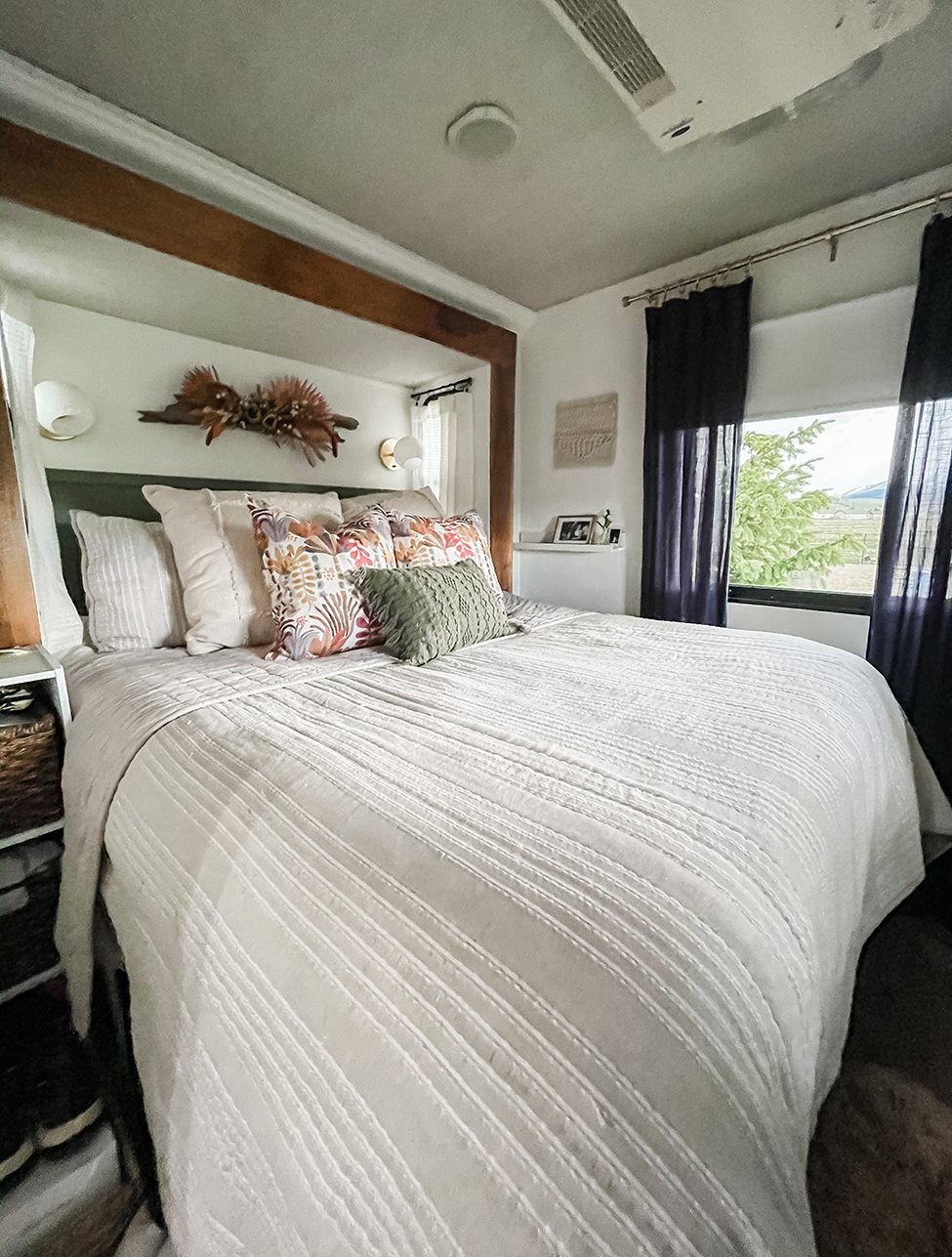 Updating hardware is like adding on the perfect earrings to your outfit. It’s also an inexpensive way to update the outdated stock hardware usually found in an RV. We mixed it up by putting some champagne bronze pulls in the kitchen and bathroom, then matte black pulls in our bedroom. On windows, don’t be afraid to remove the hideous, bulky valances. We added blackout shades to keep heat and light out, and we installed curtain rods just like in any home.