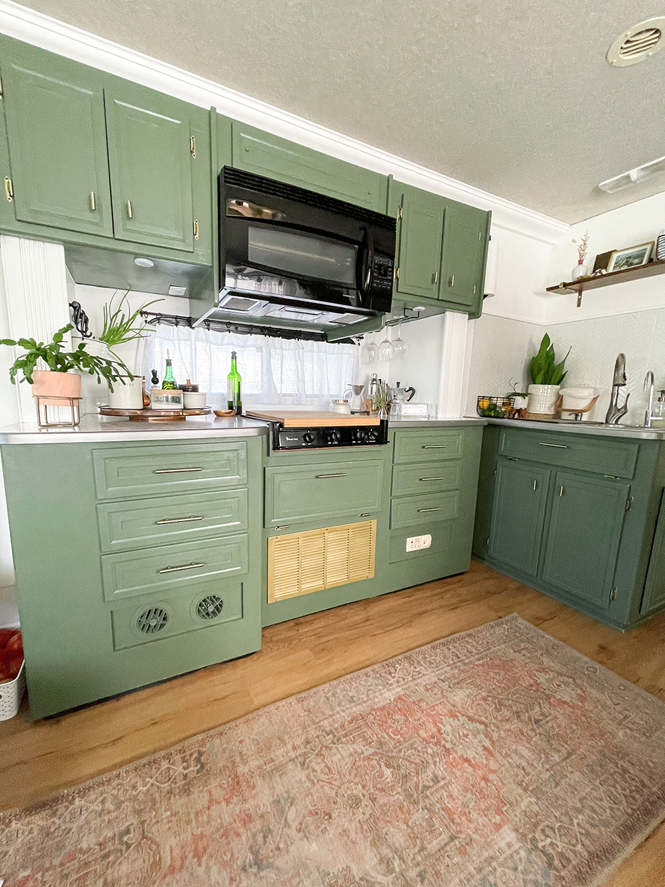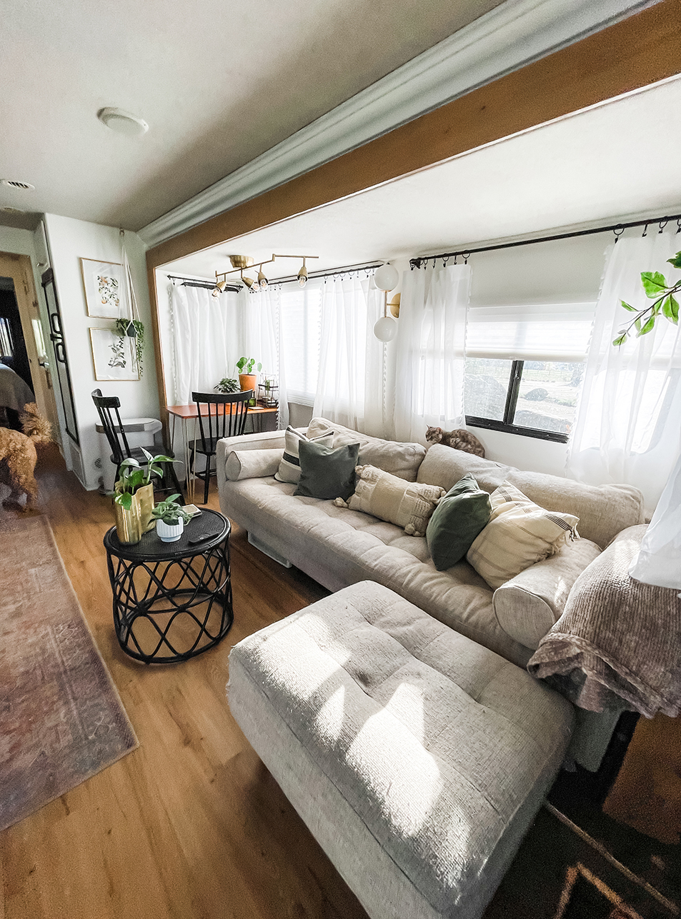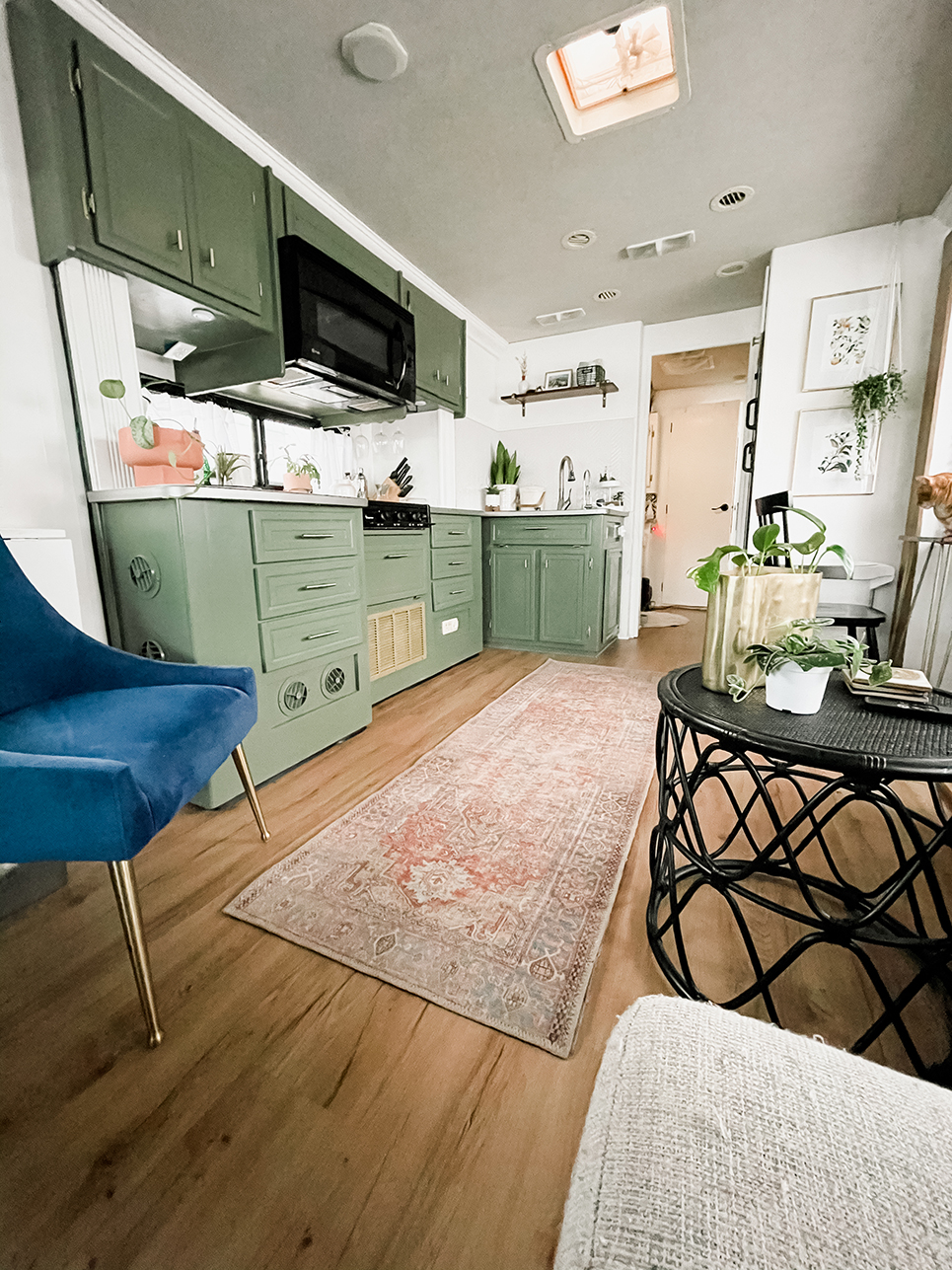 Take inspiration from “real homes” you like and figure out how to replicate it in your RV. You can make a huge impact by painting walls and cabinets, updating floors, and adding new hardware and window treatments. Bring in decor that makes you happy. For us, that was splashes of color and my plant collection. My boyfriend and I are both artists, so we enjoy having color in our home. We painted our kitchen cabinets and headboard green to tie in nature, then we added a bold Rifle Paper Co. wallpaper in our bathroom. It may not be for everyone, but we love it!
