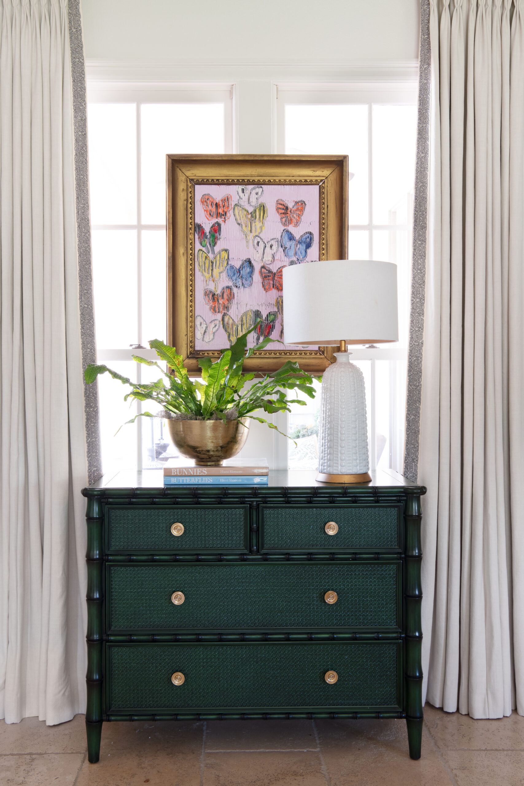 “This was part of a much larger project where our client wanted to integrate some of her antiques into a much more youthful and vibrant aesthetic,” Cannon says. “We turned to her beautiful collection of artwork as a starting point for the color palette and joyful vibes.”