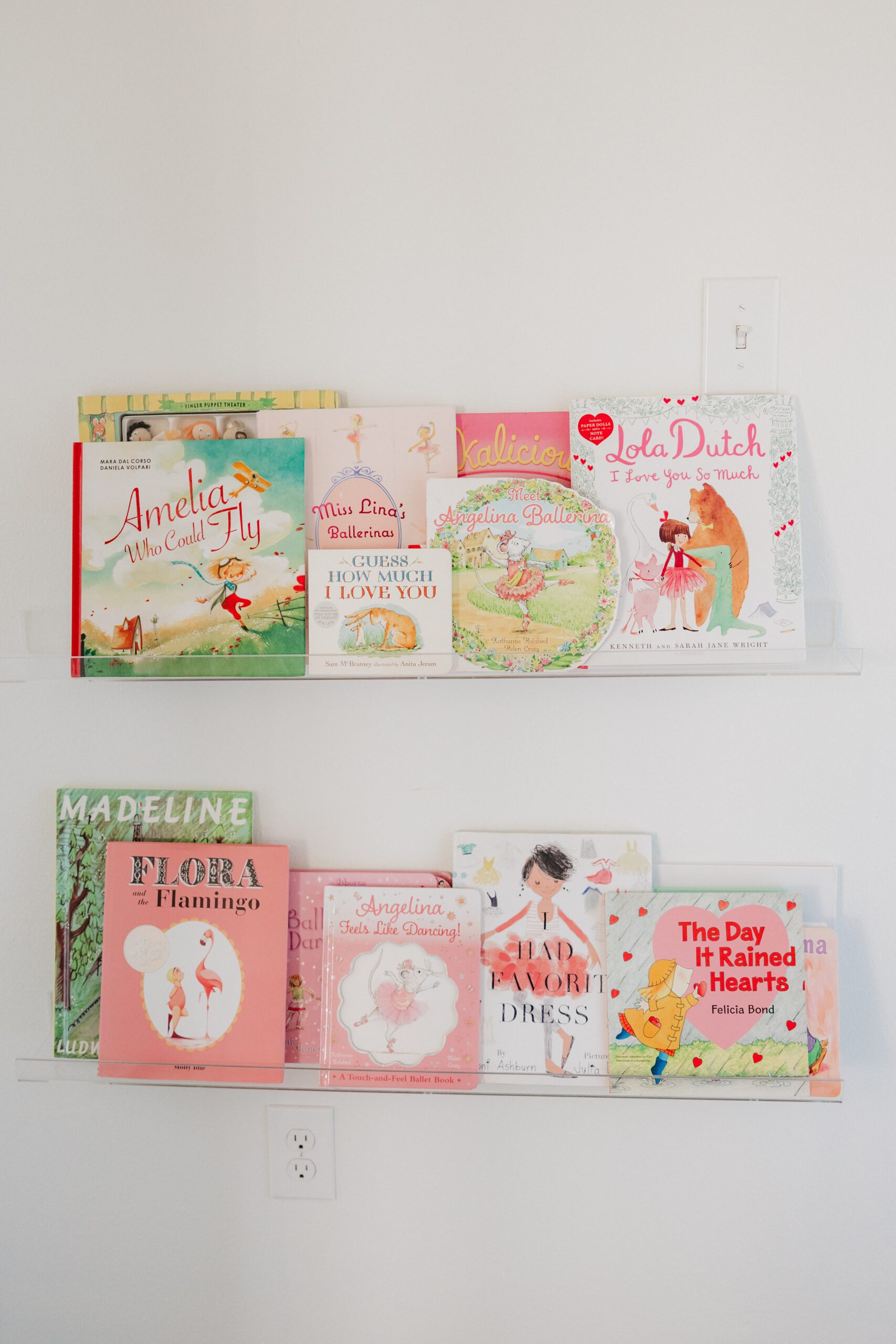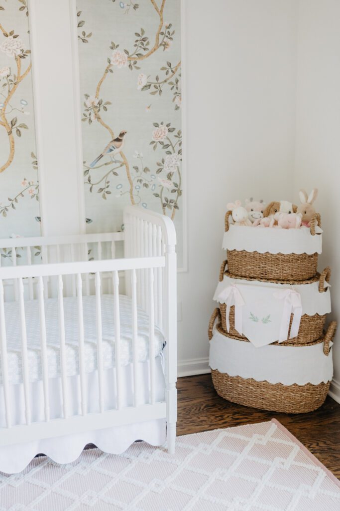 For example, the stacked baskets in the corner of the room add functionality for storage and adorable design, of course. “These stacking wicker baskets with scalloped liners are so helpful for keeping the room organized and free of clutter,” Emily says, adding that displaying a few stuffed animals in the top basket is the perfect way to add a playful element to the space.