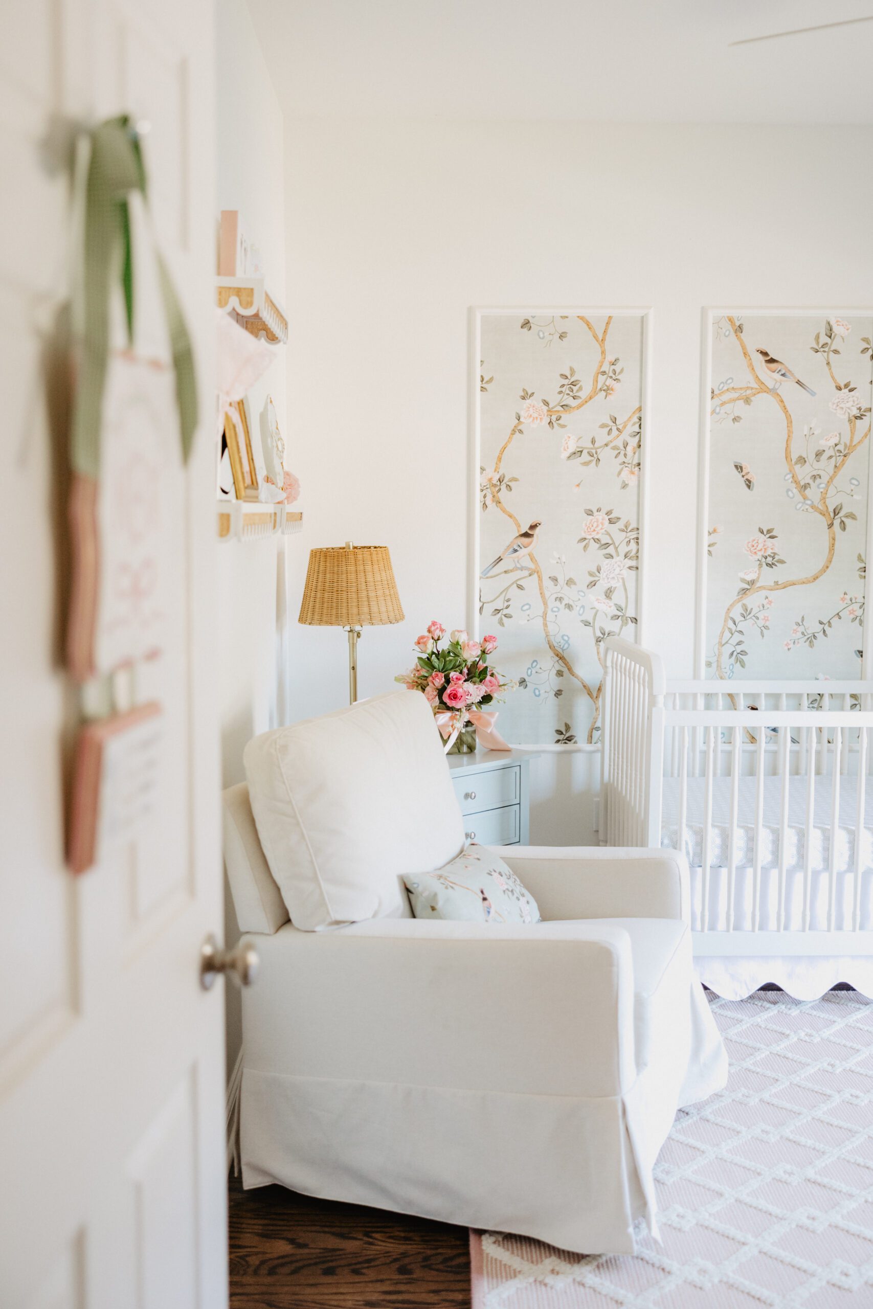 Emily says the foundation of the room’s design came from the framed wallpaper panels. Pulling inspiration from the feminine pattern and the pastel color scheme, she included soft greens, blush pinks and hints of blue throughout the space.