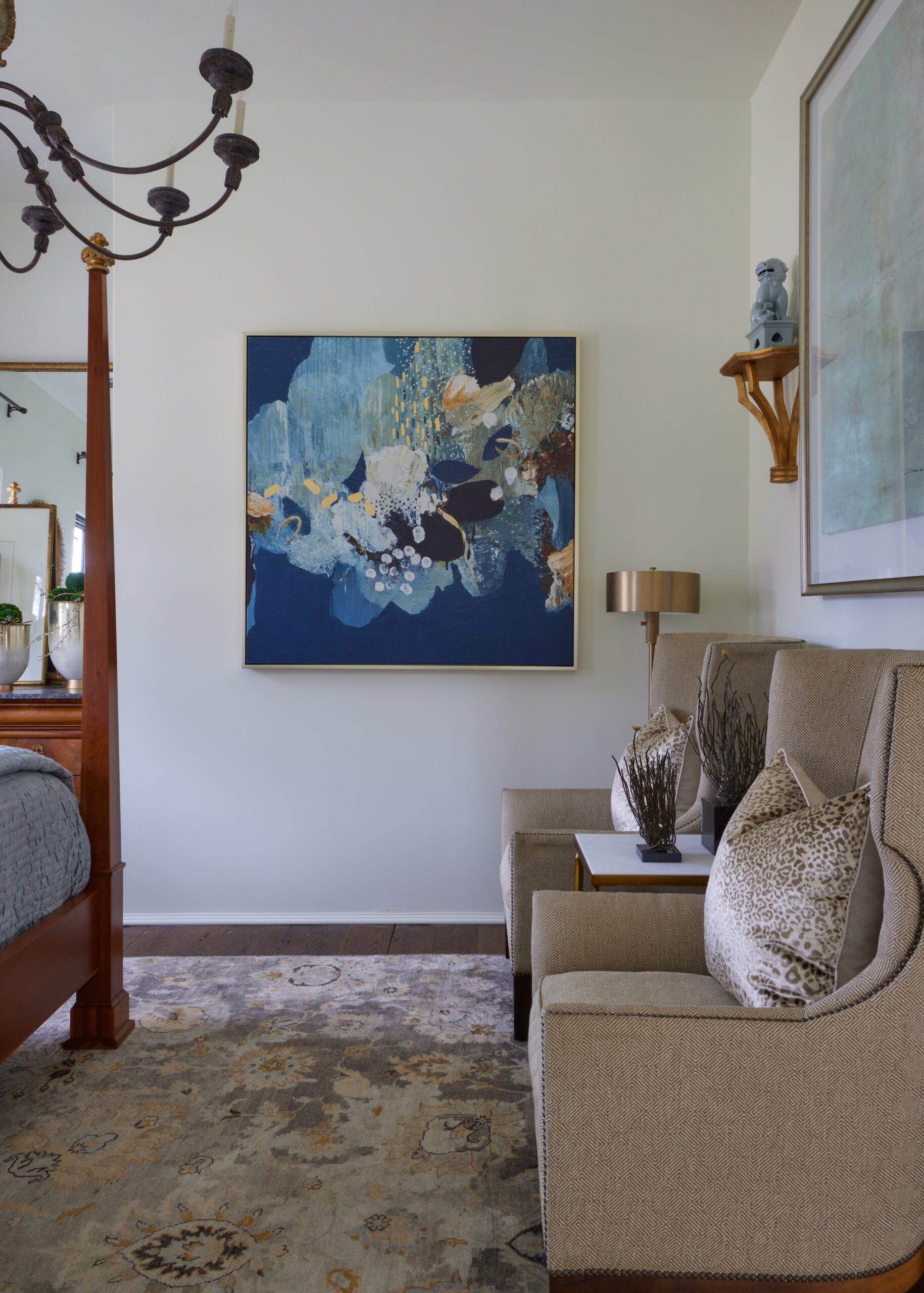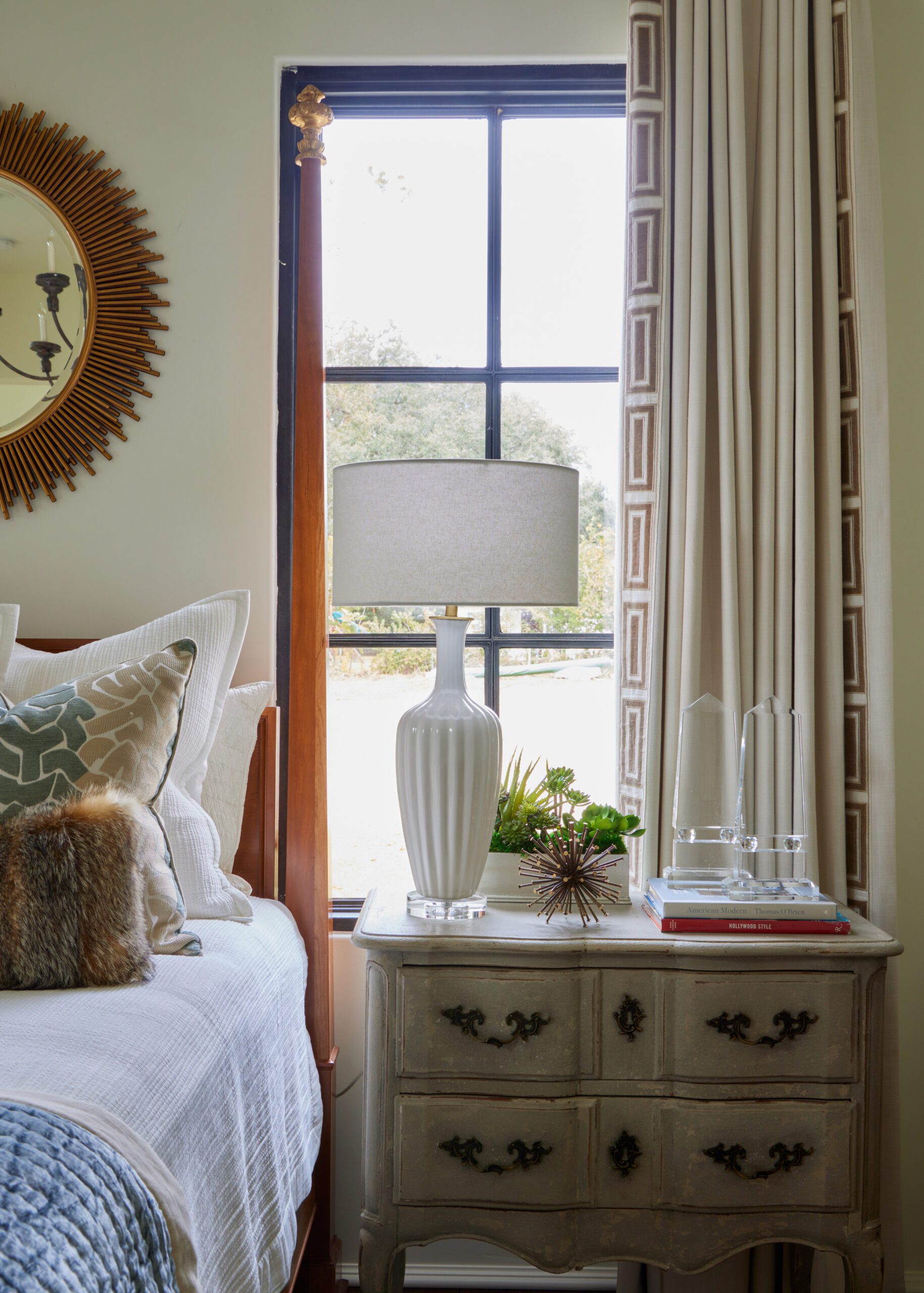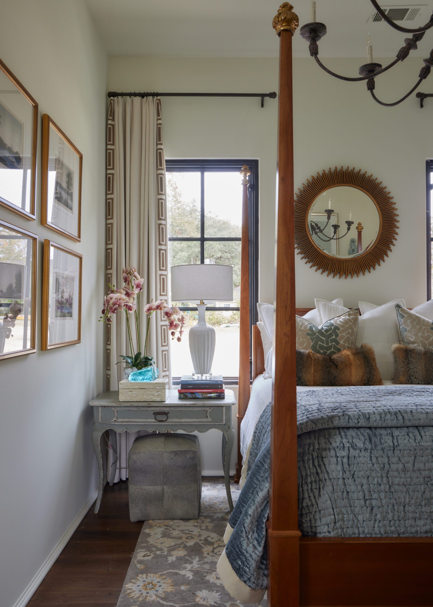 Unmatched 18th-century French side chests from Provence Antiques in Port Allen flank the four-poster queen-size bed, with a gray cowhide pouf tucked beneath the tabletop on one side. Nolan dressed the bed in luxe layers, beginning with an off-white textured coverlet and Euro shams, then topped with an ocean blue velvet coverlet and fox fur lumbar pillows. Underfoot is a Cyrus bamboo silk rug. The chandelier is an updated take on a classic form by Bliss Studio, and the custom Ingot banded draperies are by Stroheim. A sunburst mirror hangs above the bed, reflecting the light and the room’s many interesting details.