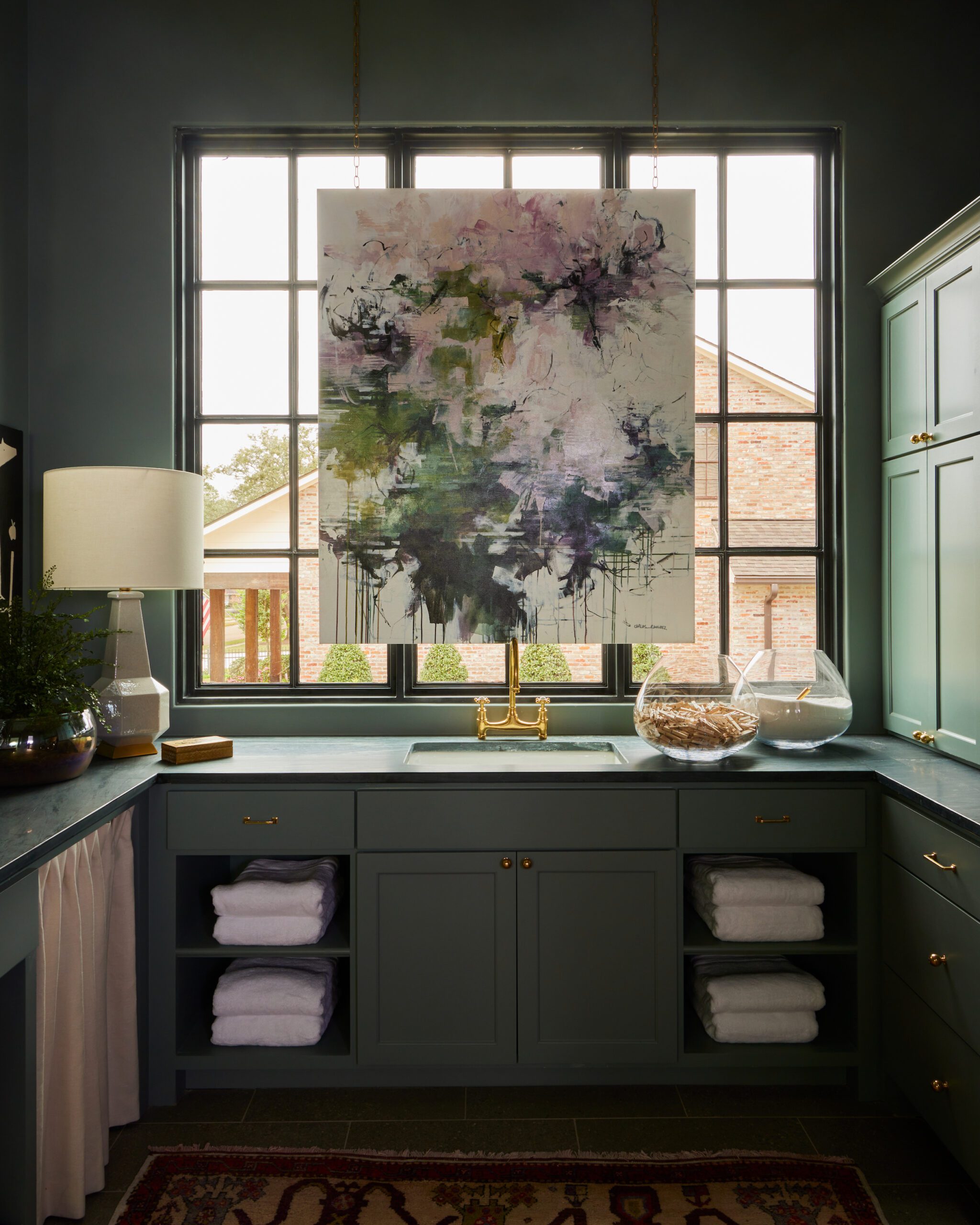 With its 12-foot ceilings and expansive size, the laundry room Cannon decorated for the 2021 Ivy House Designer Show Home had a head start on that wow factor from the initial build. Cannon capitalized on the room’s spaciousness and natural light by painting the walls in a deep green and adding a salon wall featuring a mix of original artworks from Ann Connelly Fine Art, along with a large Carlos Ramirez painting suspended from chains in front of the window. The color palette plays perfectly with the dark soapstone countertops from Triton Stone, upon which Cannon displayed essentials including clothespins and detergent in glass vessels.