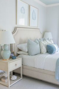 Walker combined what the homeowner had with new pieces for a refreshed look and feel. For example, Walker utilized the existing bed and bedding. But she purchased items including the bench, custom pillows in blue hues, bedside table accent lamps in pale blue and the Mike Klung botanical artwork hanging above the bed.
