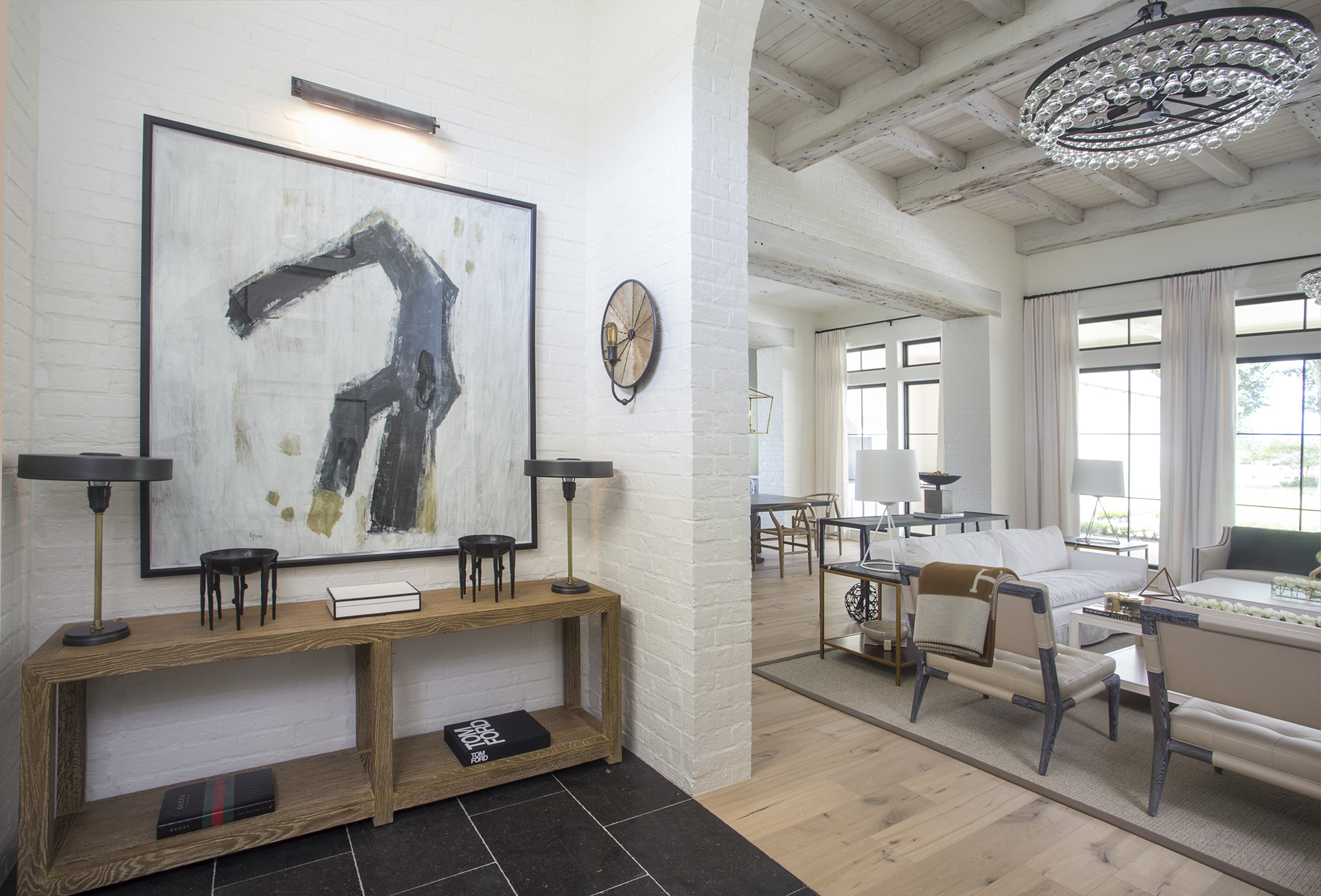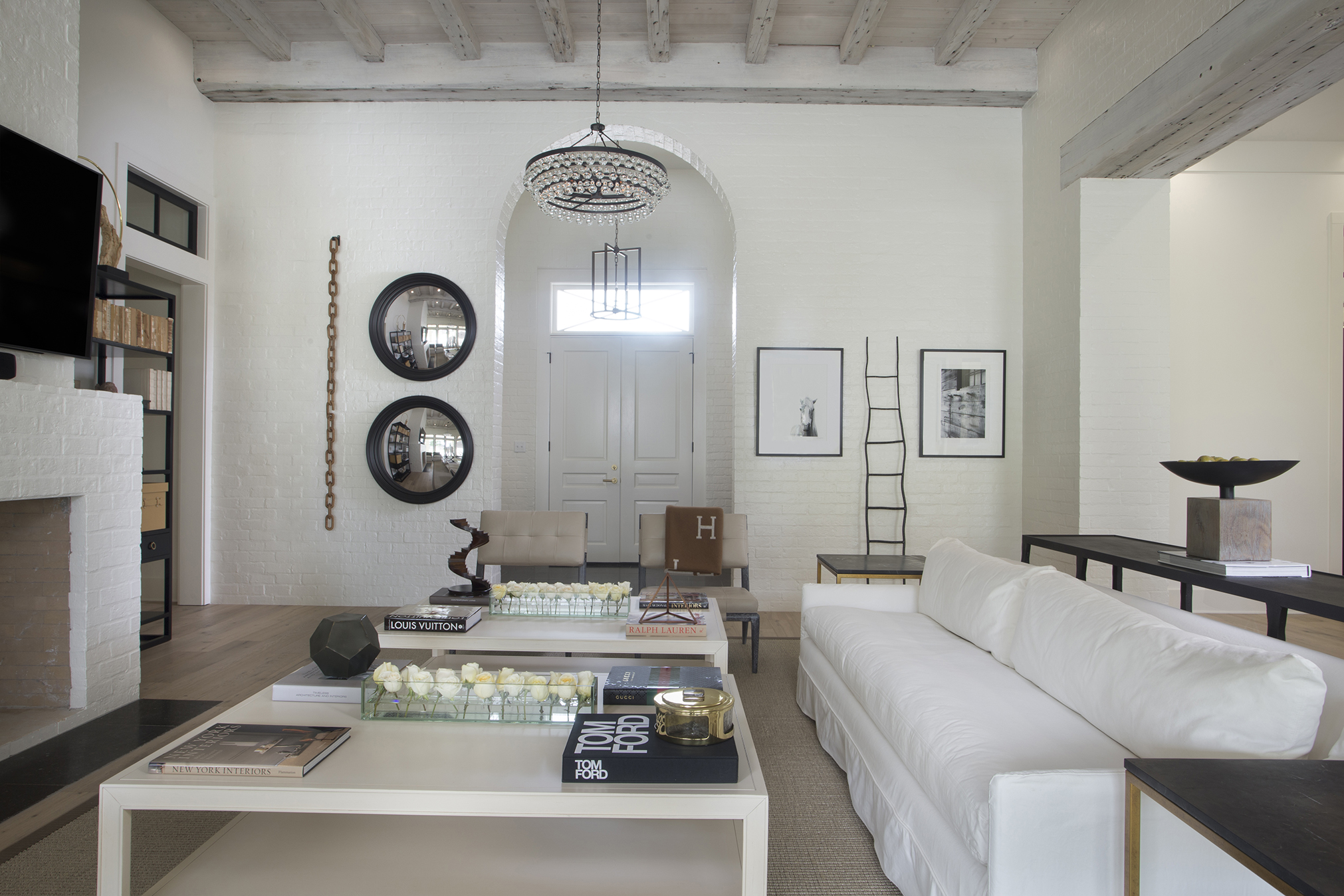 In an effort to balance out the newness of a custom-built home and suggest history and patina, oversized 200-year-old salvaged beams were installed on the 14-foot-high ceilings in the living room and lightly whitewashed to modernize their rusticity.