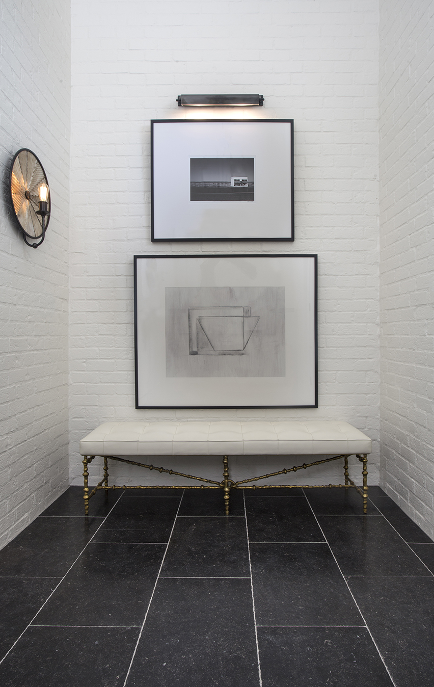 The foyer floor was laid using salvaged honed black marble, while pale wood flooring was used throughout the rest of the home. White-painted brick walls also added age to the space. The public areas encompassing the foyer, living room, dining area and kitchen were designed in the spirit of a modern loft, the kind commonly found in Tribeca or SoHo.