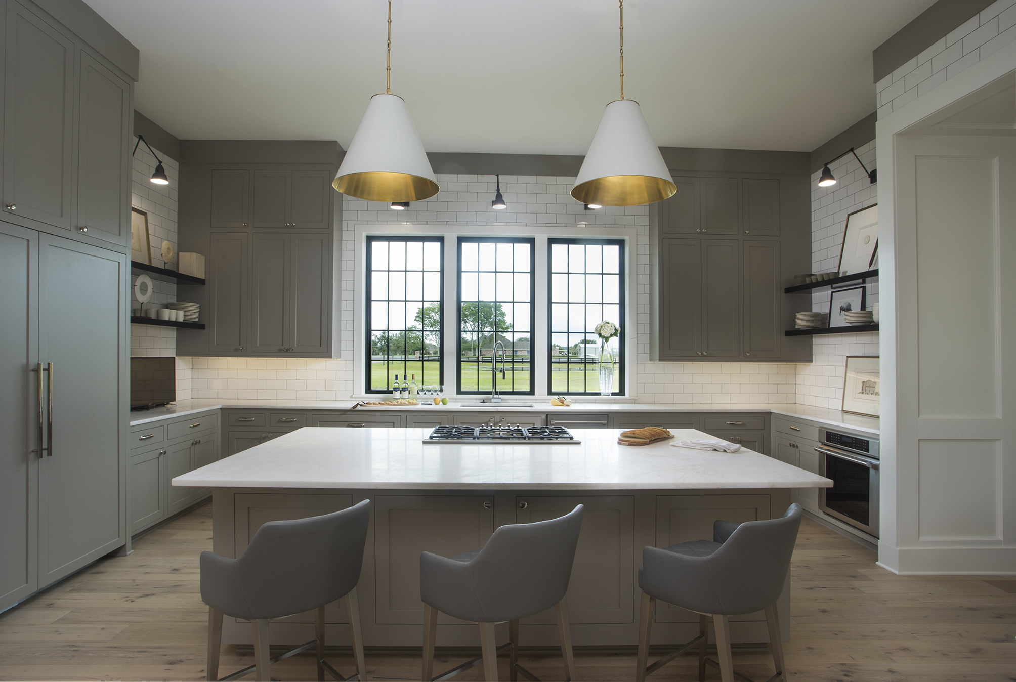 A monastic interior design focus might seem too cold and sparse to become a warm and welcoming home for the Heberts and their two children. But Larkins and Lyndsey were determined to make this ambitious plan a reality. The first decision, of course, was the choice of windows—significant because the color of them would drive the entire exterior color scheme of the home. From there, Larkins and Lyndsey collaborated to strike a balance in eliminating architectural embellishments (such as crown moldings) typically expected at this level of home construction with a result that looks deliberate and not thrifty.