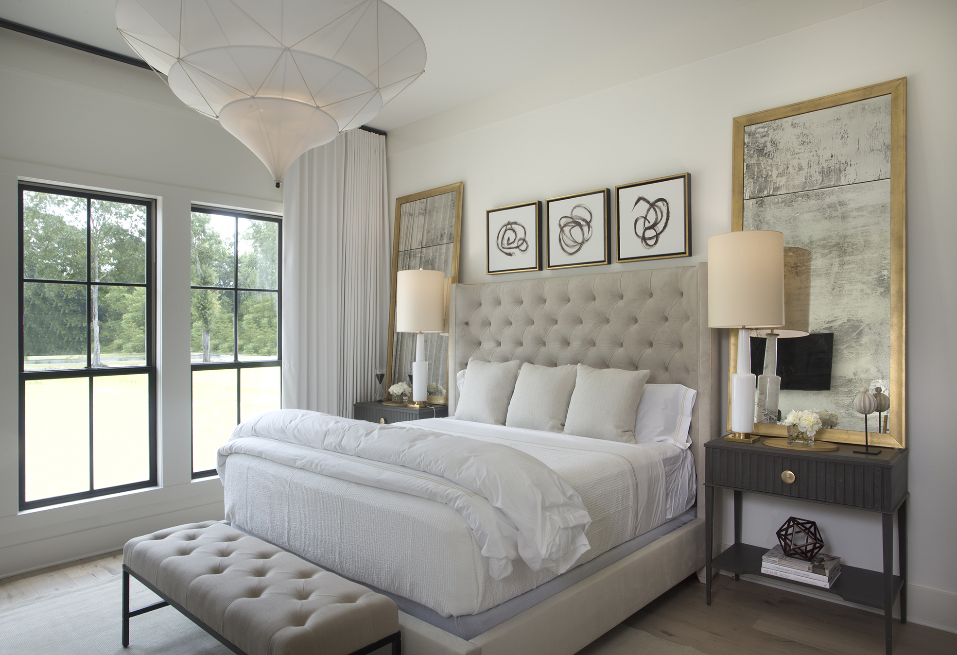 The monastic design of the interiors is in stark contrast to that in the Heberts’ previous home, which was completely traditional in nature. Because of this, only the tufted bed in the master bedroom made the move to the new house—every other piece of furniture was purchased deliberately to work with the space. This gave Larkins license to create a complete look in which every item used complements the vision of the space.