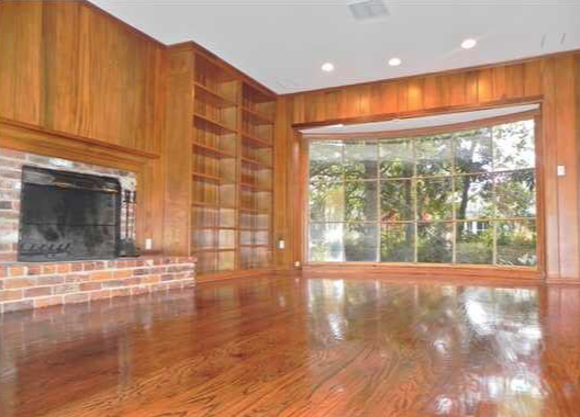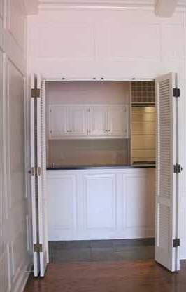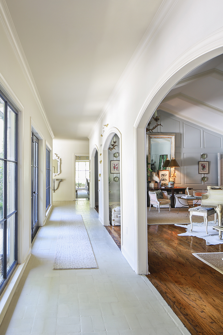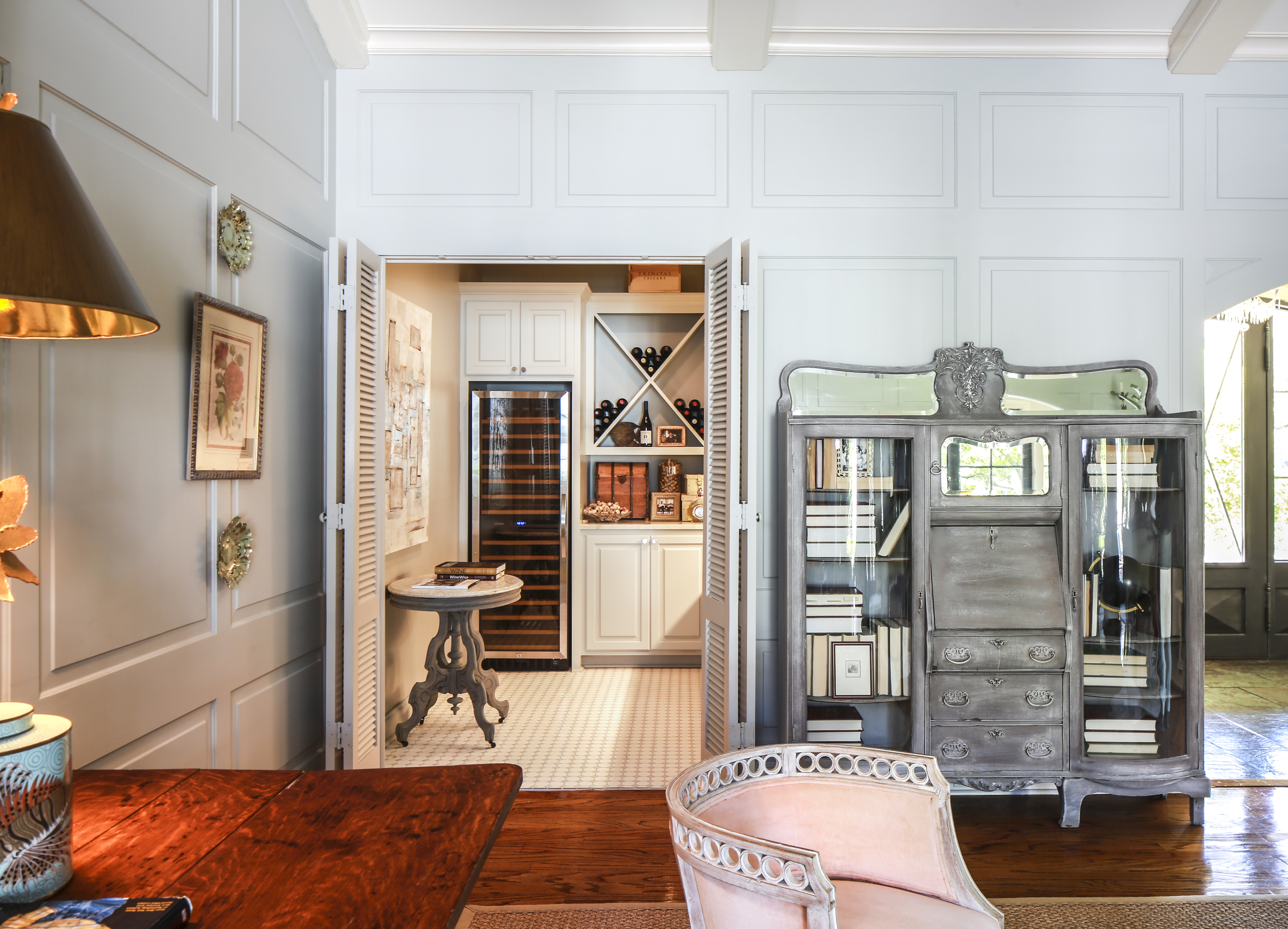 Inside, the couple’s first task was also to brighten things up. They replaced printed wallpapers and stained wood paneling with pale paint colors, and Kristin even painted the brick floors of a hallway that wraps around the courtyard. From there, they tackled the makeover in stages, adding new lighting and converting a dated wet bar off the living room into a welcoming wine room.