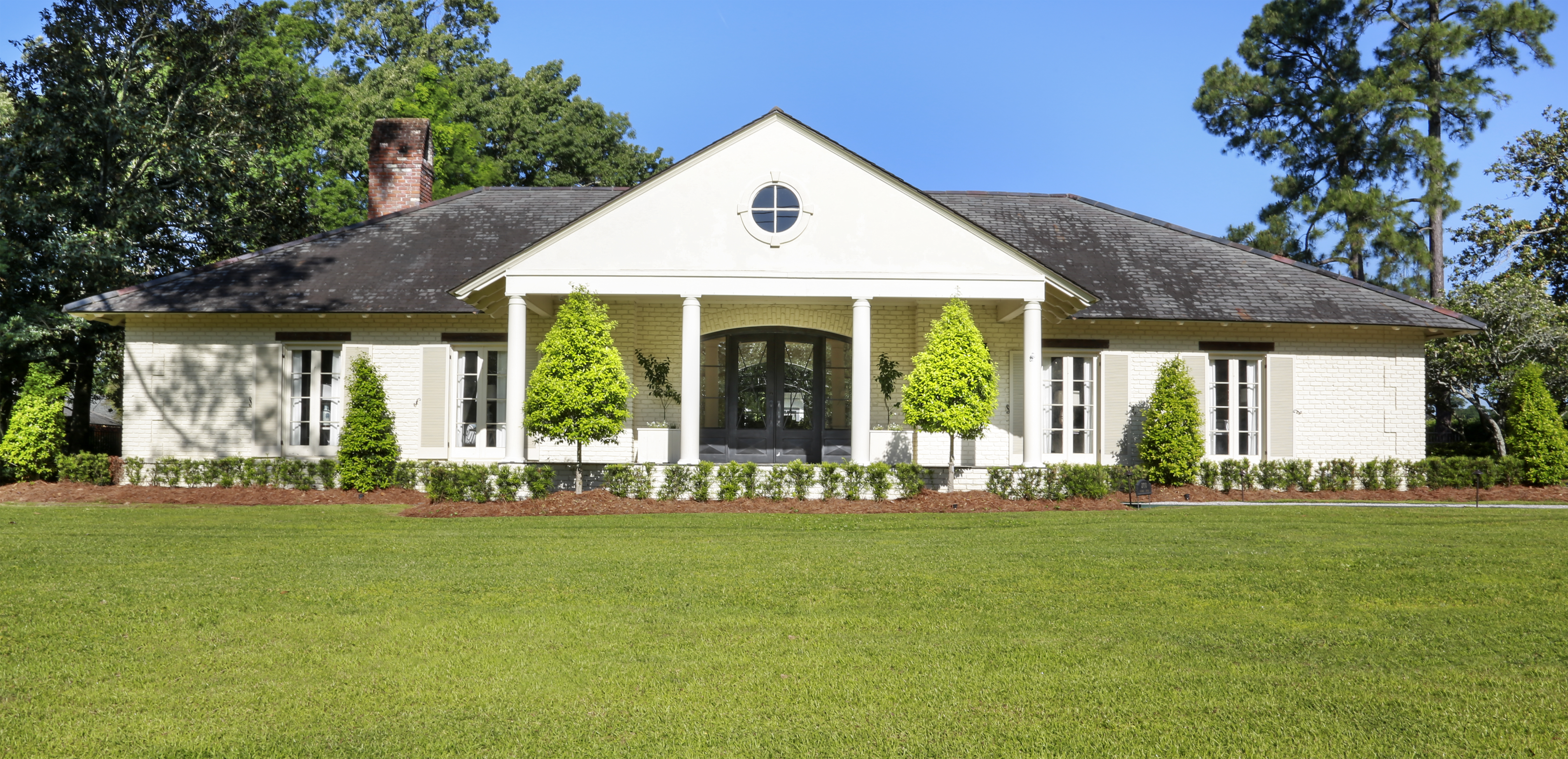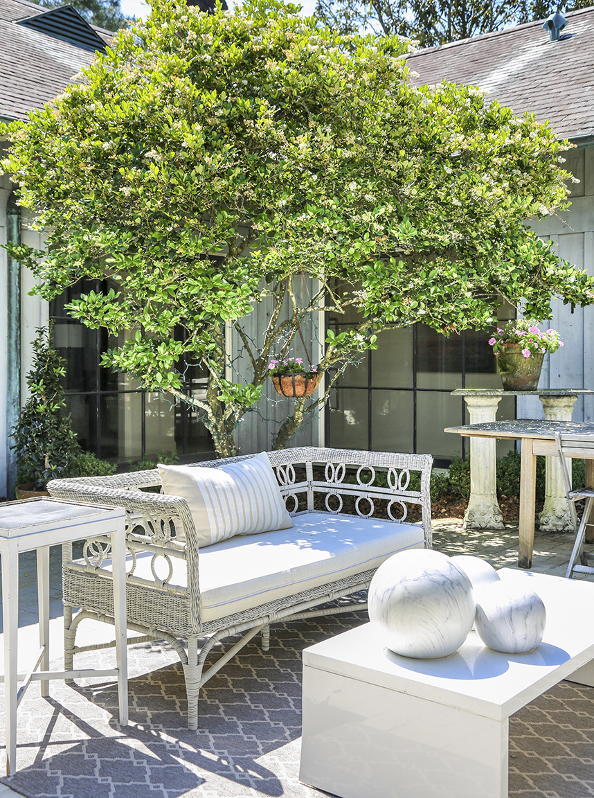 Outdoor living areas received their own revitalization, from the removal of heavy tropical plantings in the central courtyard to the replacement of a backyard pool with a pergola-topped deck and formal gardens. “I didn’t want just a lawn and a brick patio,” Kristin says. “I wanted paths and little vignettes. I love having an open space that allows us to use the whole outdoor area.”