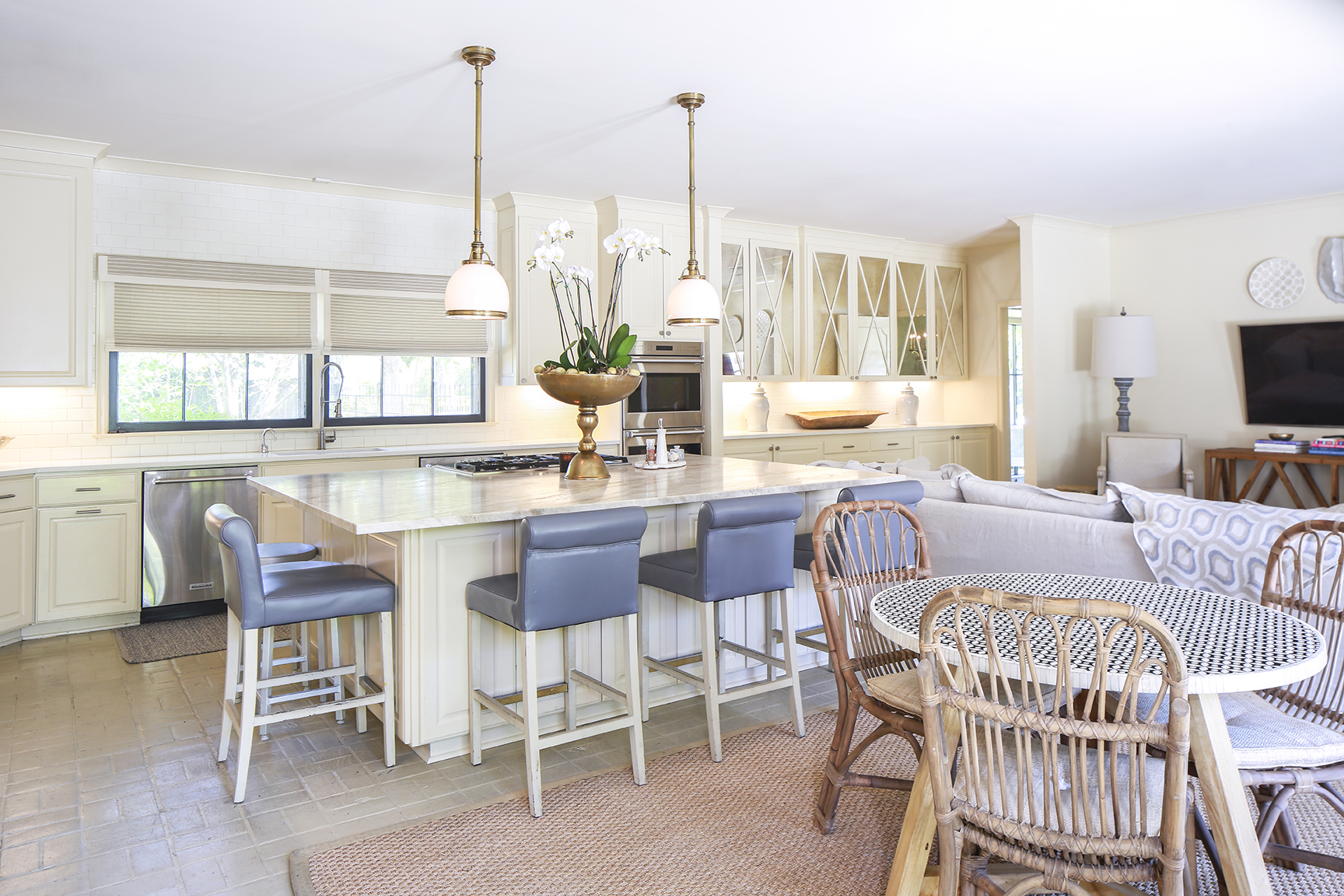The kitchen and keeping room saw some of the most striking changes. The two spaces had originally felt disconnected, thanks to a large central tower of cabinetry and ovens, so Kristin and Zack placed the ovens against an exterior wall and eliminated a wall between the keeping room and a butler’s pantry. Aesthetic changes in this area included replacing dark green granite countertops with heavily veined quartzite on the island and a more subdued quartz on the perimeter. “We just wanted a very comfortable space,” Kristin says. “This is the most used area in the house, for sure.”