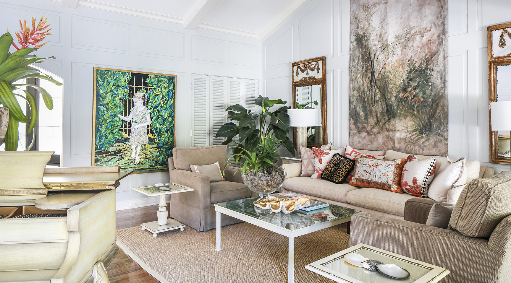 The large-scale artworks in this vaulted-ceiling space include a portrait by Zack’s sister Kim Stafford Kennedy and a floral wall hanging that once blocked sunlight inside the Red Onion shop. The sofa and the collection of colorful pillows atop it are from McMillin Interiors.