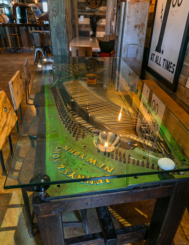 But once inside the barn, visitors quickly realize that they haven’t escaped to a typical rustic locale. John’s vivid paintings are matched with found items that they’ve had refurbished, other art and collectibles, plus unique treasures that hold their own stories. A 10-foot-long stuffed alligator caught by John and their sons is mounted on cypress and holds court above the bar. Barbershop chairs from the 1930s serve as seating, tables are made from pianos, and light fixtures include one crafted from a trombone. Old trucks reign supreme in this scene: A 1950 Chevy was made into seating, a 1952 Ford was cut in half and put on the wall to serve beer, and old car and truck headlights can be found hanging overhead casting new light through old lenses.