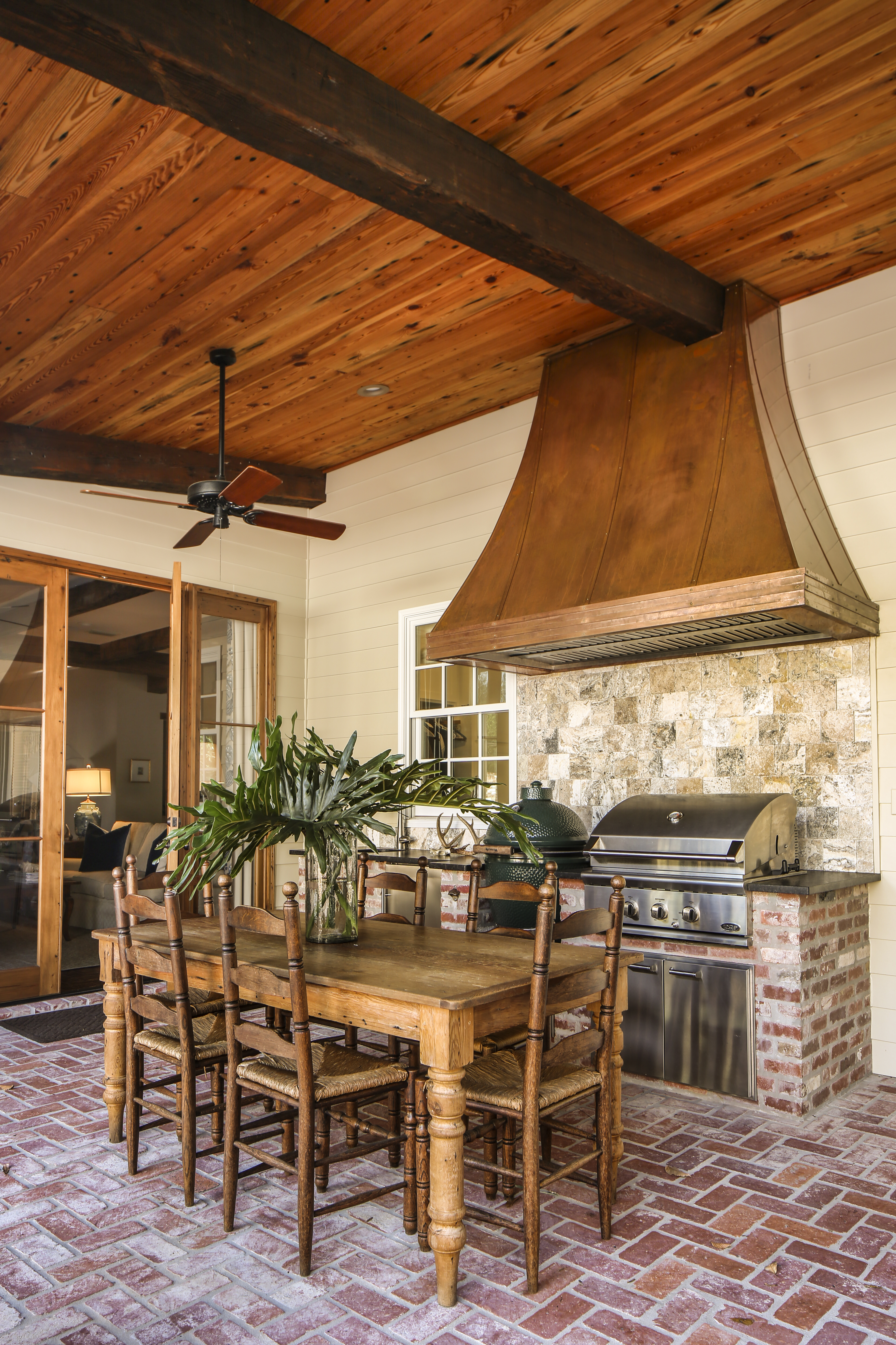 The Strohscheins’ outdoor entertaining space maintains classic Louisiana elements like warm brick and copper. Photo by Melissa Oivanki.