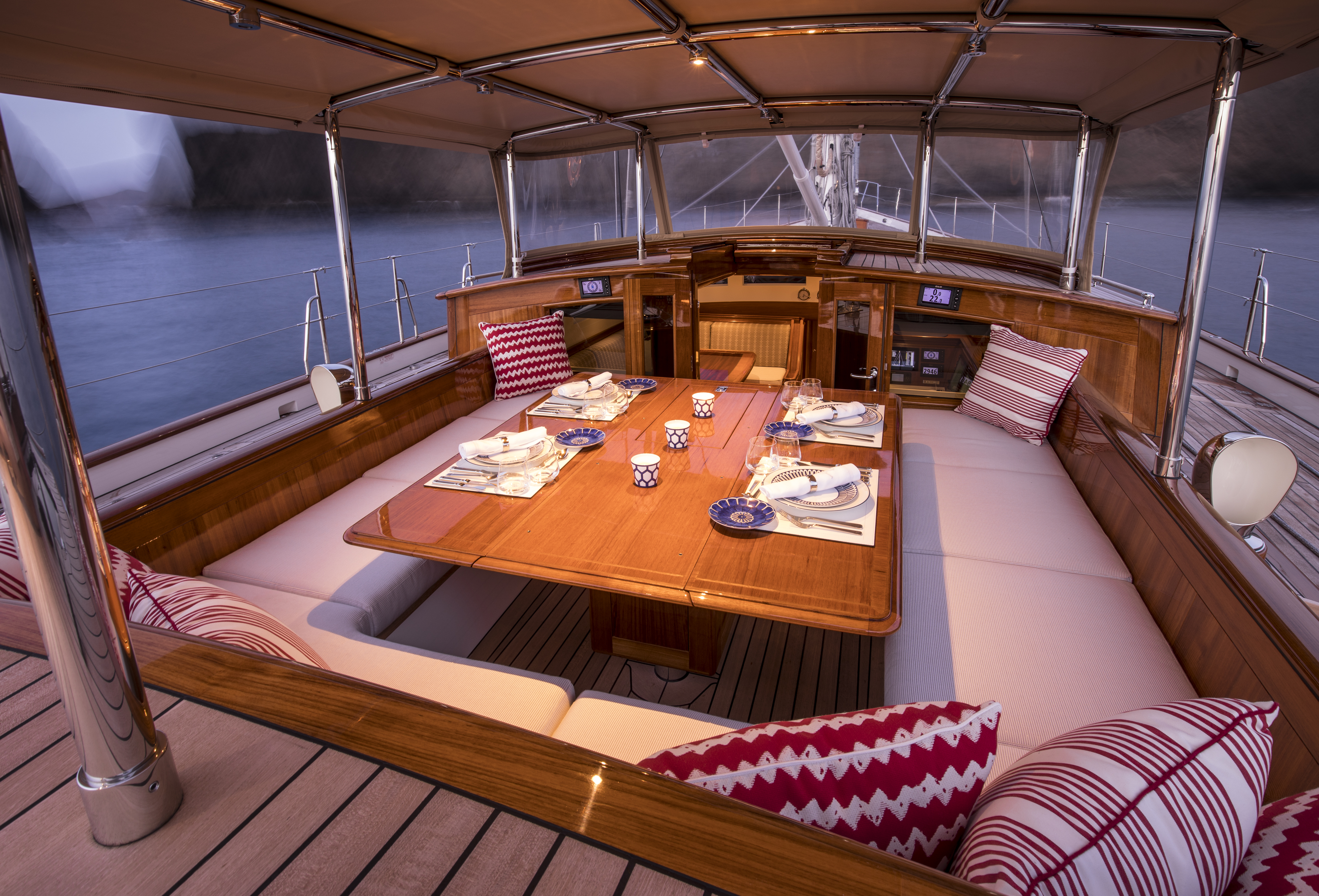 Who can resist a yacht? This one, with interiors designed by Colleen Waguespack, allows for maximum comfort with a large banquette, while red pillows key into the nautical theme. Photo by Onne van der Wal.