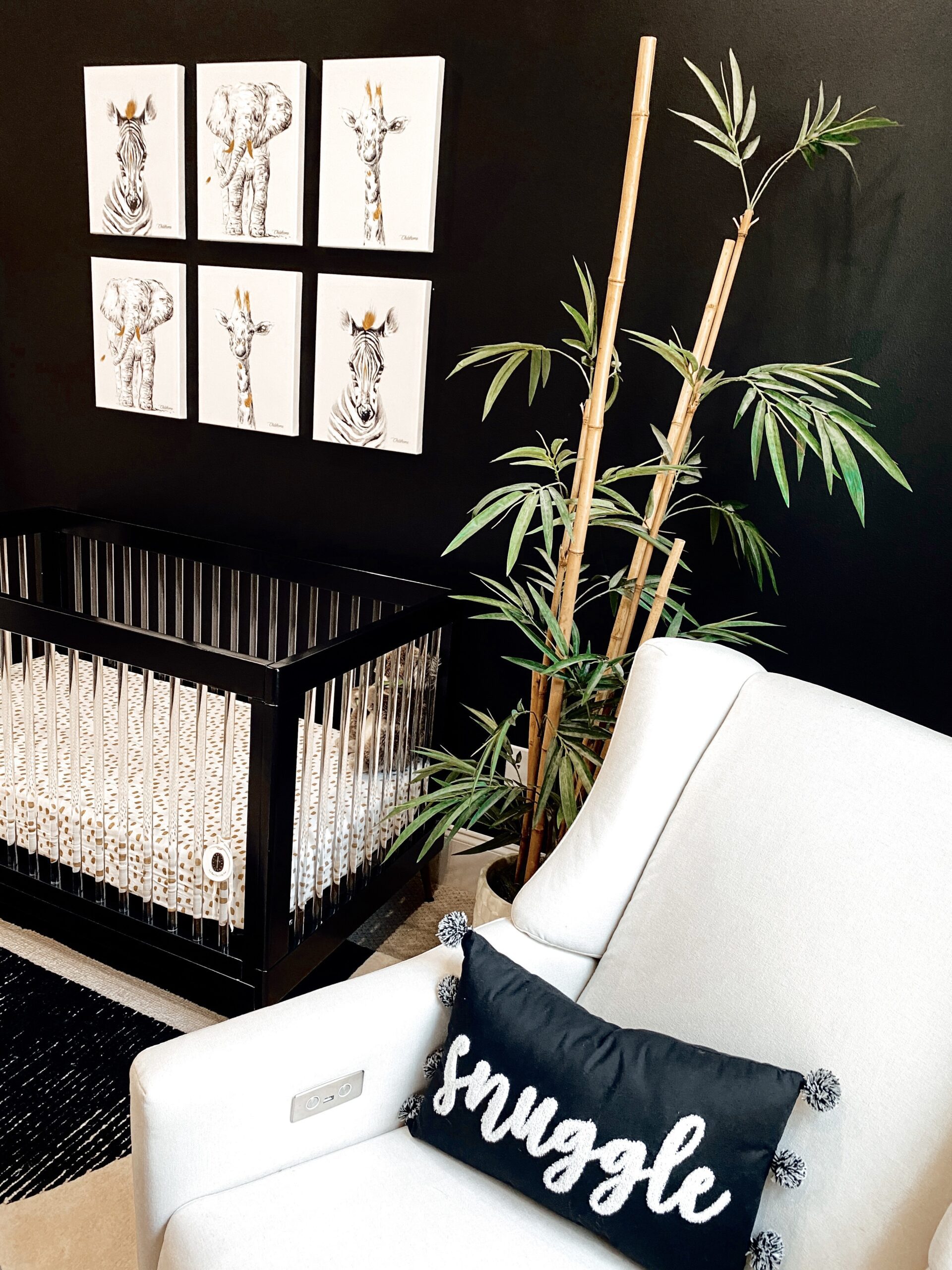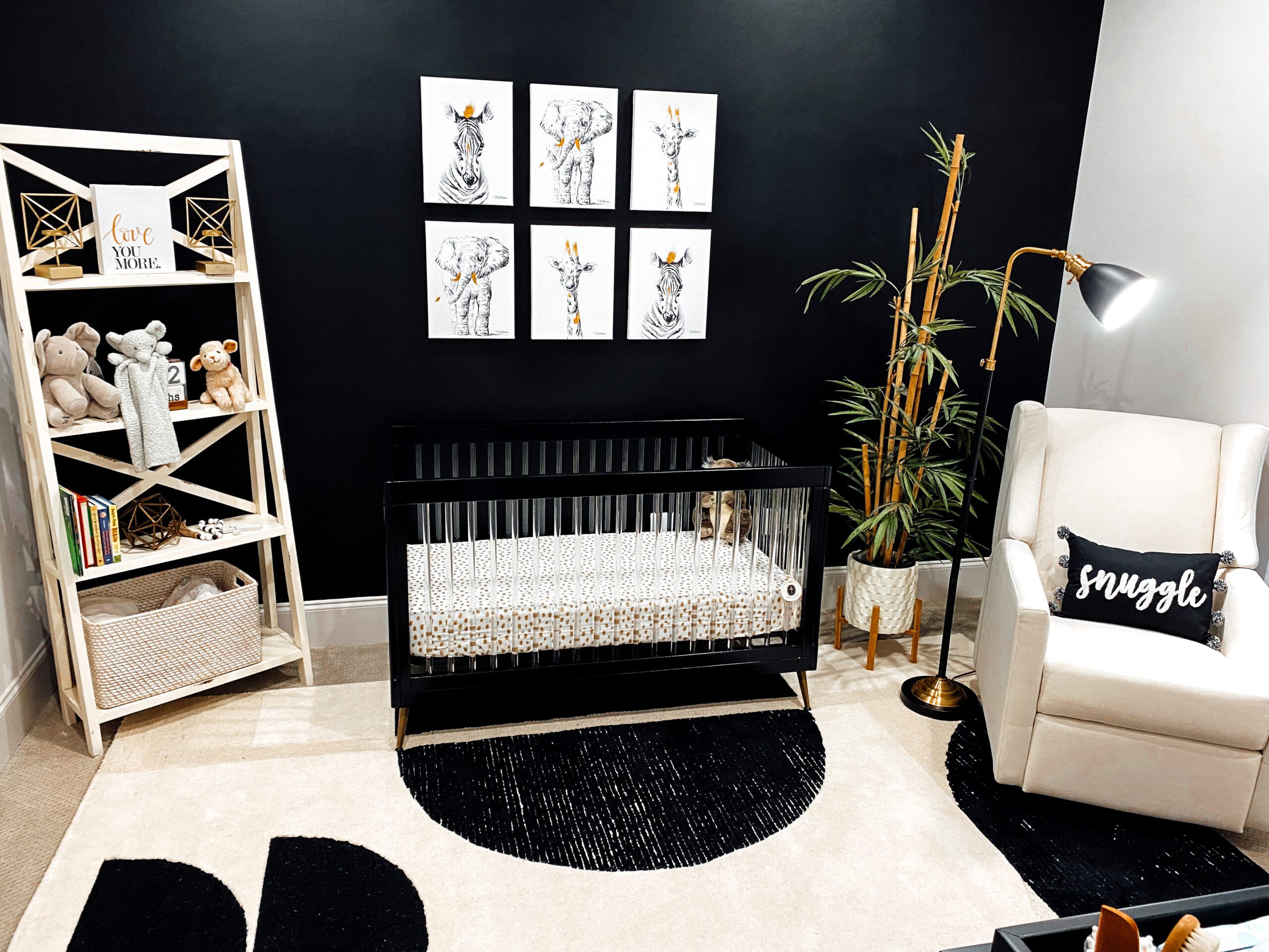 When Rachel Eggie Gibbs started designing her gender-neutral nursery, she wanted it to be anything but, well, neutral. A bold accent wall in Sherwin Williams’ Tricorn Black—the same color used in Rachel’s salon, EGGIE Salon Studio—set the stage for the entire space. “I honestly didn’t know it was bold until I sent the final picture in our family group text,” Rachel says, recalling the funny responses from her brother and other family members. “I know black and white aren’t typical for a nursery. I wanted it to still feel babyish without taking away from the modern look, so I started searching for little baby safari animal prints. Girl or boy, who doesn’t like baby animals?”