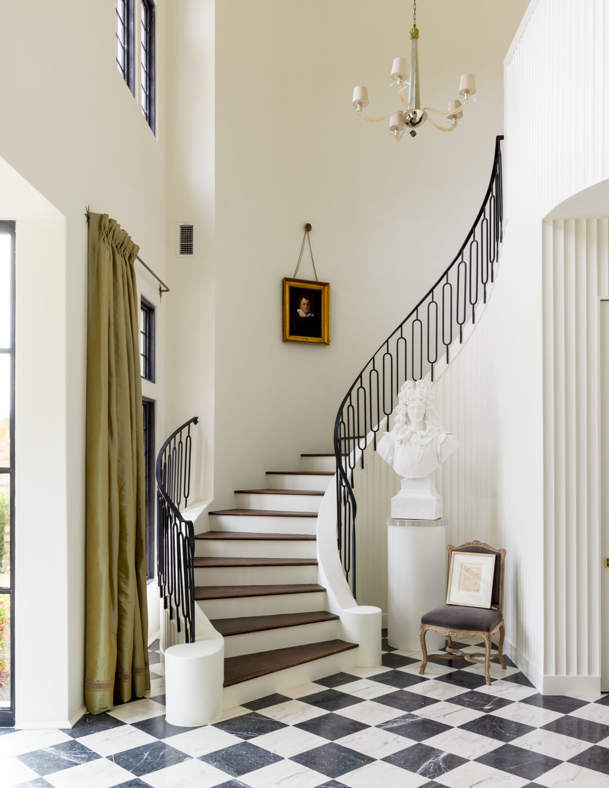 Since limited furniture is needed in a foyer, McDaniel made the most impact through a selection of artworks. A large yellow expressionist piece by Ed Pramuk, whose work McDaniel first saw on display at LSU in the 1980s, was sourced with the help of Ann Connelly Fine Art. Titled “Portal Flare,” the piece brings a dose of color to the space and helps to translate McDaniel’s vision of a bright, post-COVID world. To juxtapose the minimalist work, portraits in a range of styles are dotted throughout the space. Immediately below the Pramuk work, atop an iron and marble console table in the style of Gilbert Poillerat, is a black-and-white photo by South African visual artist Zanele Muholi. Across the room, an oversized bust of the Sun King is framed by the staircase, while an early Flemish portrait of a boy is suspended from a medallion and chains in the stairwell.