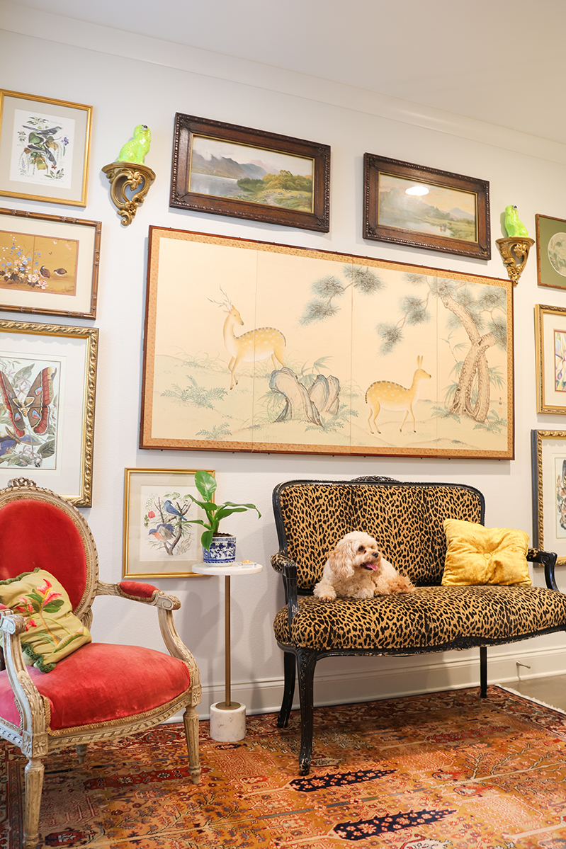 A Samsung Frame television allows for plenty of video game playing without sacrificing the design. To accessorize both this corner and the rest of the space, Bergeron opted for animal-centric antiques and finds, with a few of the homeowners’ vintage robots sprinkled in here and there.