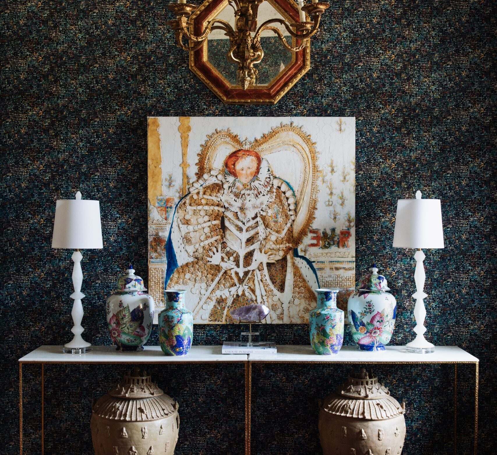 With plenty of light coming in from a large, windowed front door, design professional Dan Bergeron opted for deep shades of navy and red in this foyer featured in the January 2024 issue. Rather than paint the walls one color, Bergeron opted for a densely patterned wallpaper that pulls in all the colors of the rainbow. Photo by Kim Meadowlark.
