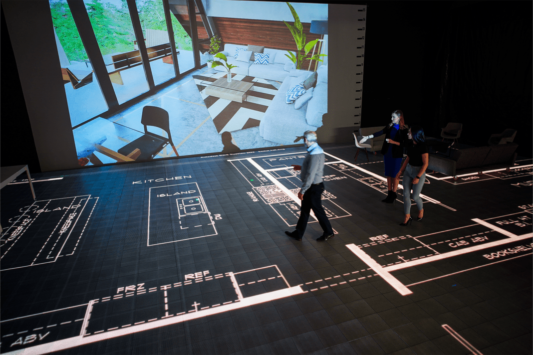 The 30-foot-by-30-foot computer screen is accompanied by a projector screen, offering both 2D and 3D walk-through experiences. “We hope to become a normal part of the construction and custom building process,” Accardo says. “Just like a car, we believe you should try it before you buy it.”