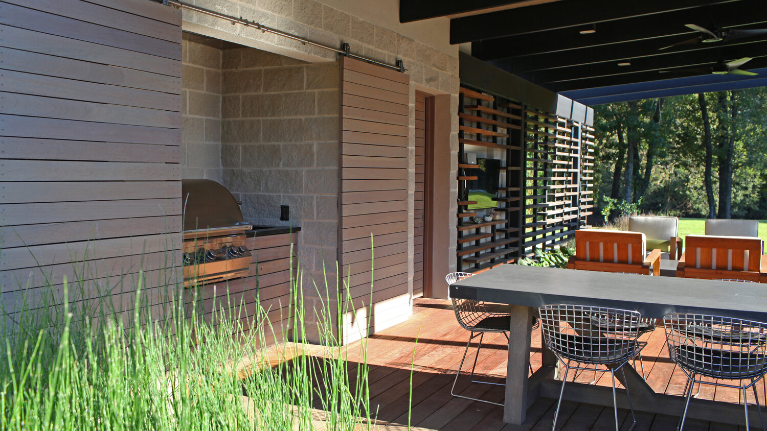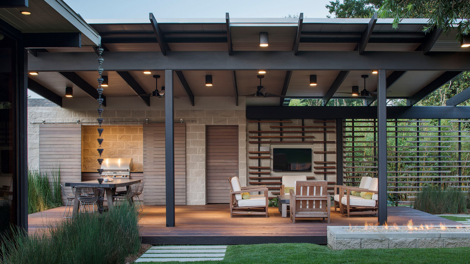 • The outdoor kitchen is tucked away behind sliding panels, hidden from view when not in use.