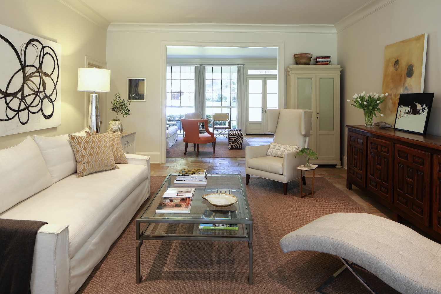 An adjacent bedroom has been converted into a dressing area and closet with vanity, drawers, mirrored cabinets and a freestanding island with pull out bins. Two additional bedrooms each provide a private bath.