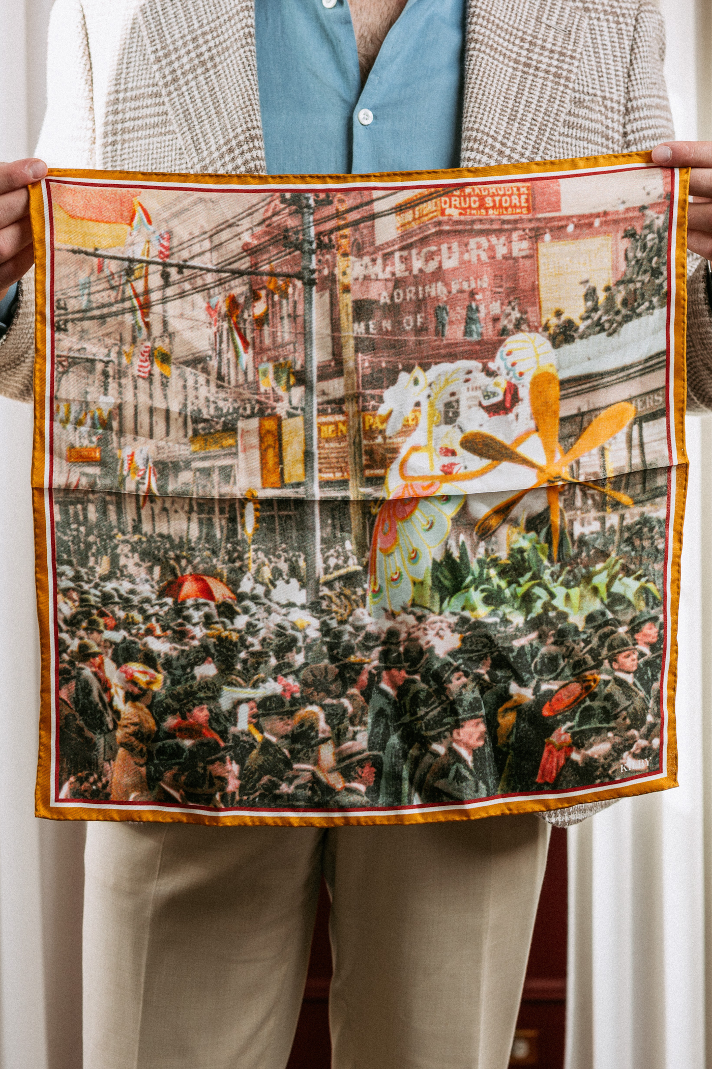 “The vintage postcards we chose feature more off-the-beaten-path imagery, like Pontchartrain Beach and the Rex parade going down Canal.” Kristen says of the scarves designed in-house with help from Sonny Mitchell, and handmade in a small workshop in Italy, where they also craft the brand’s ties.