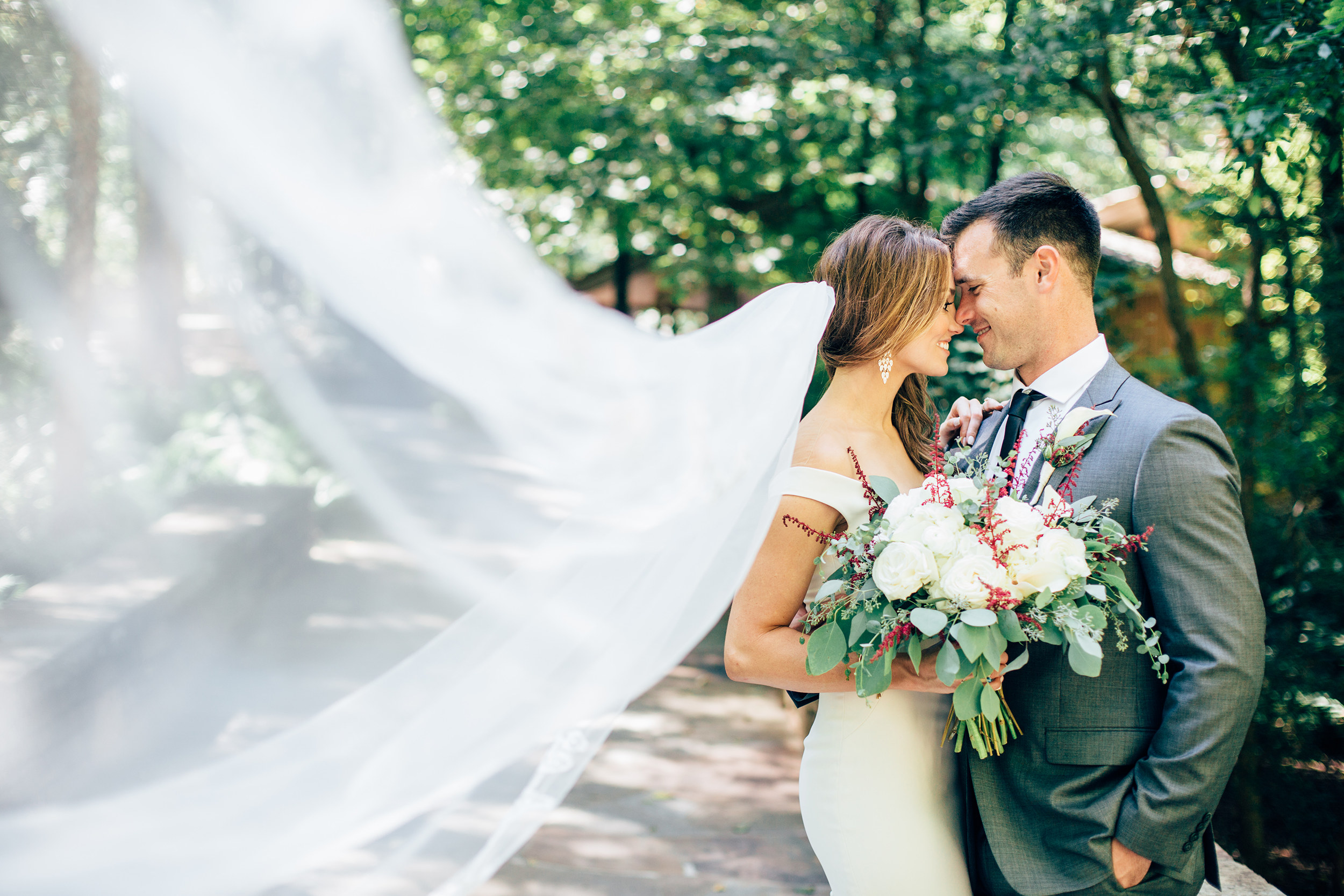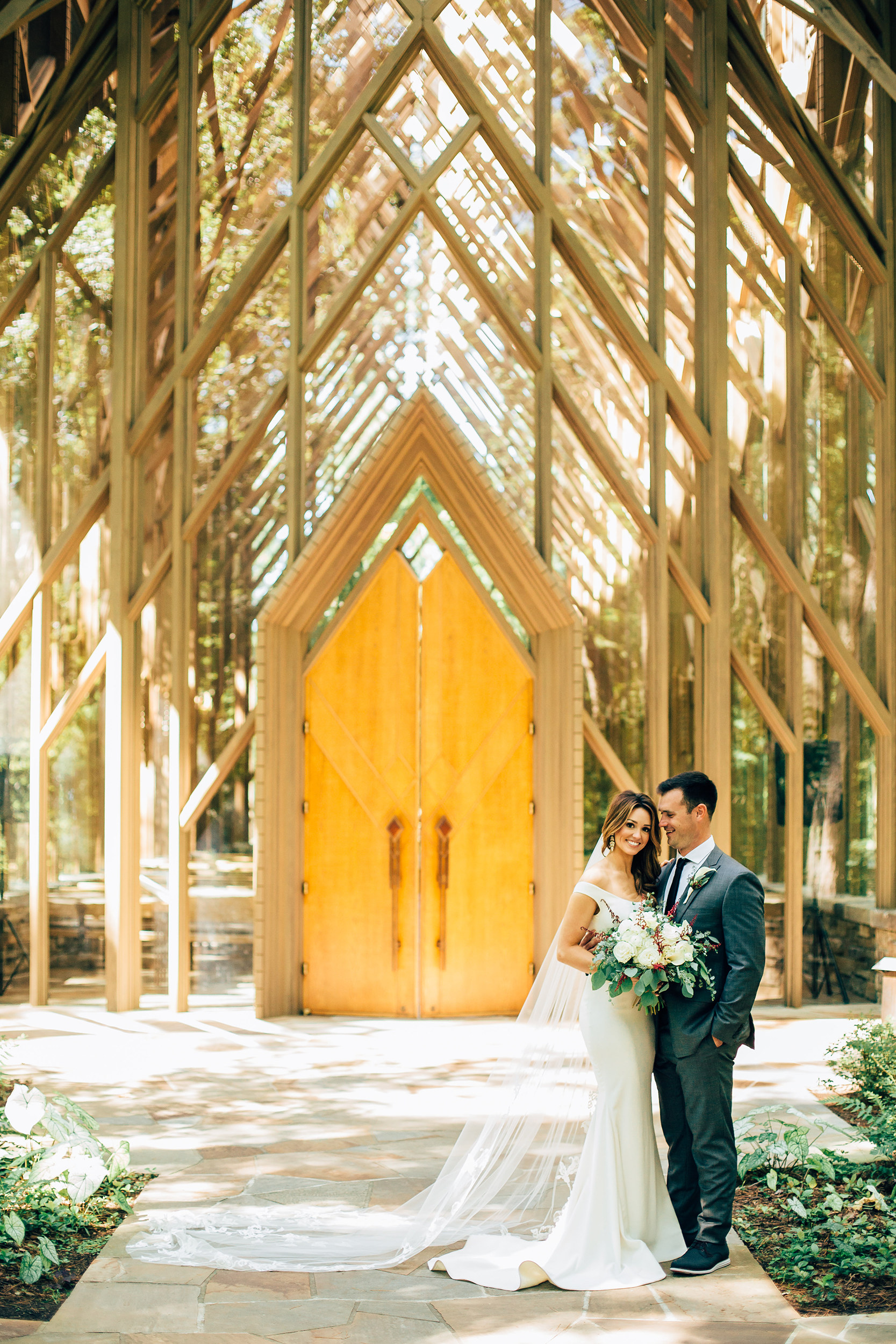 Southern pines and majestic oaks surround Anthony Chapel, the six-story-tall structure in Hot Springs, Arkansas, made of floor-to-ceiling glass and large pine timbers. Here, light dances off the flagstone floors. It was the picturesque backdrop for the marriage of Rachel Eggie and Micah Gibbs. Rachel, a stylist, is usually behind the scenes at weddings, making brides and their wedding parties look their very best. Since weddings take up many of Rachel’s weekends, she and Micah decided their own wedding would be a small, intimate ceremony. The chapel in the woods of northwest Arkansas proved to be the perfect place. “We were just surrounded by God’s greatest gift, nature, and it was the most peaceful feeling,” says Rachel. The duo wrote their own vows and were married by their personal pastor. After the ceremony, they changed into casual attire, hit a local restaurant and danced with the DJ until well past midnight. Photos by Benjamin Martin Photography.