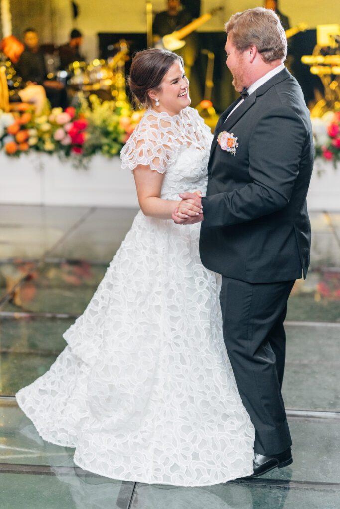 With help from rental company Party Central out of Lafayette, the backyard was prepared to host around 300 guests, featuring a reception tent situated just off the back porch that spanned most of the backyard and acrylic flooring covering the pool, with the water below reflecting off the lights.