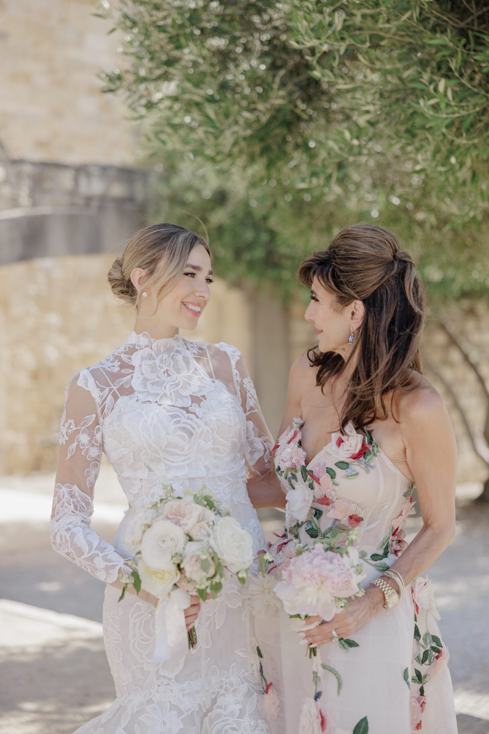 The couple had envisioned a full Catholic mass at Old Mission Santa Inés in Solvang, drawn to its hand-painted walls and proximity to Sunstone Winery. But when the families visited the mission, they discovered the ceiling had begun to cave in, and repairs wouldn’t be complete until after the wedding. With no other churches nearby, concerns mounted. Meredith turned to her mother, whose eye for design and resilient attitude made her a perfect party-planning partner. “My mom has always had the best parties. Everything she touches is amazing,” says Meredith. “I just kept thinking to myself, ‘Just trust Debbie.’ It was a team effort, and I absolutely couldn’t have done it without her.”