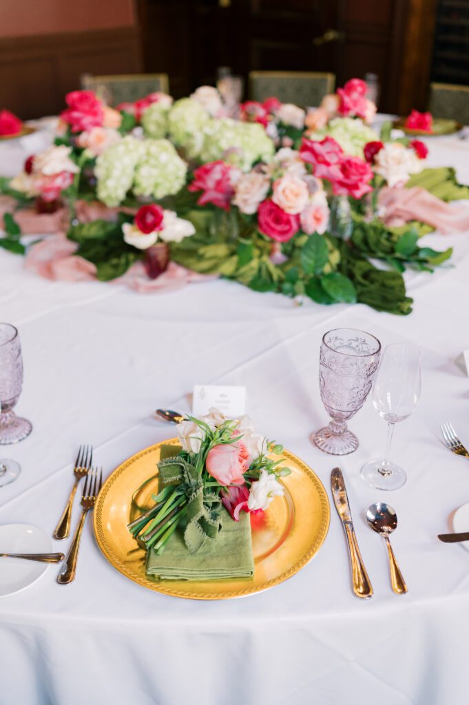 The striking floral arrangements complemented guests’ attire, which boasted every shade of pink at the request of the bride. And gilded chargers atop blush tablecloths completed the vision.