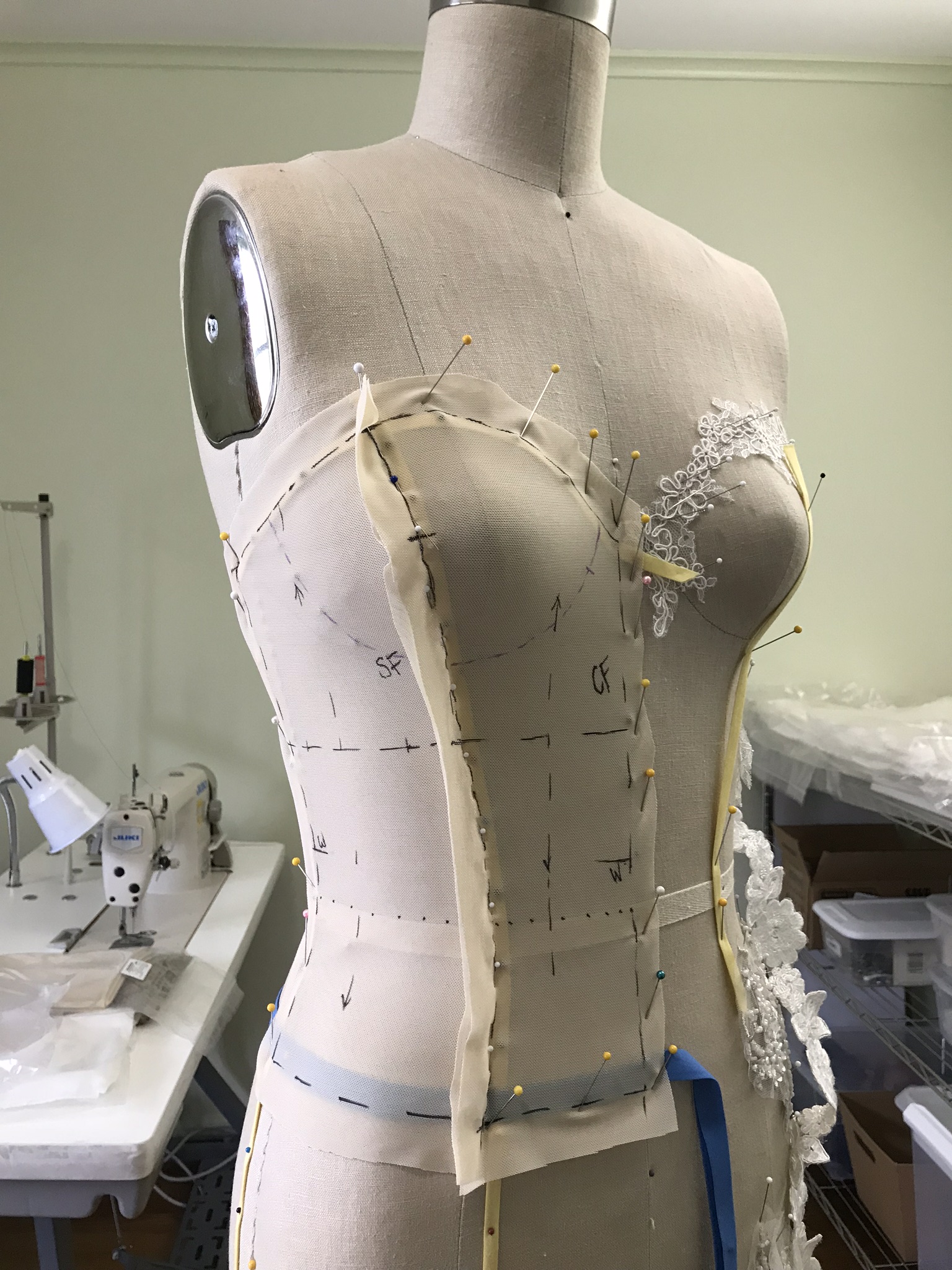 Before construction began, she teamed up with local seamstress and patternmaker Carol Keto—“who has countless years of experience altering wedding gowns,” Palfrey says—to work on translating the dress to three dimensions. It was a meticulous, multi-layered process that took a total of six months, even with both women working. “I didn’t catalog my time, but my estimate is that I spent at least 400 hours working on my dress,” Palfrey says. “By working together, we were able to share our knowledge and skills with one another, which was extremely rewarding.”