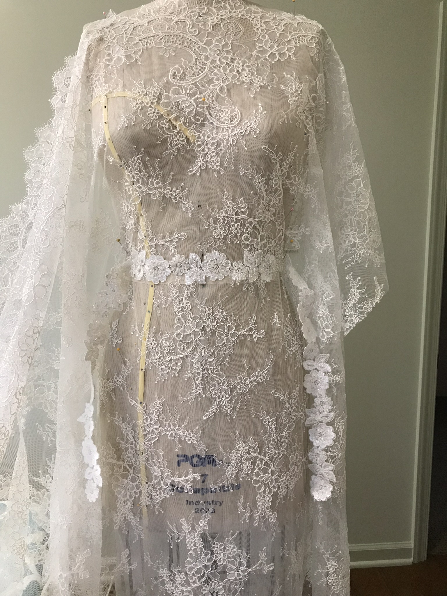After the shop closed in 2014, Palfrey moved to Baton Rouge, where she now designs commissioned garments for clients while also working in fashion retail. She has also customized wedding dresses for brides—changing details and adding elements like lace-covered sleeves to purchased gowns. The process of hand-embroidering lace into illusion netting for those sleeves would become a spark of inspiration for Palfrey’s own wedding dress when her longtime boyfriend, Joshua Newville, proposed.