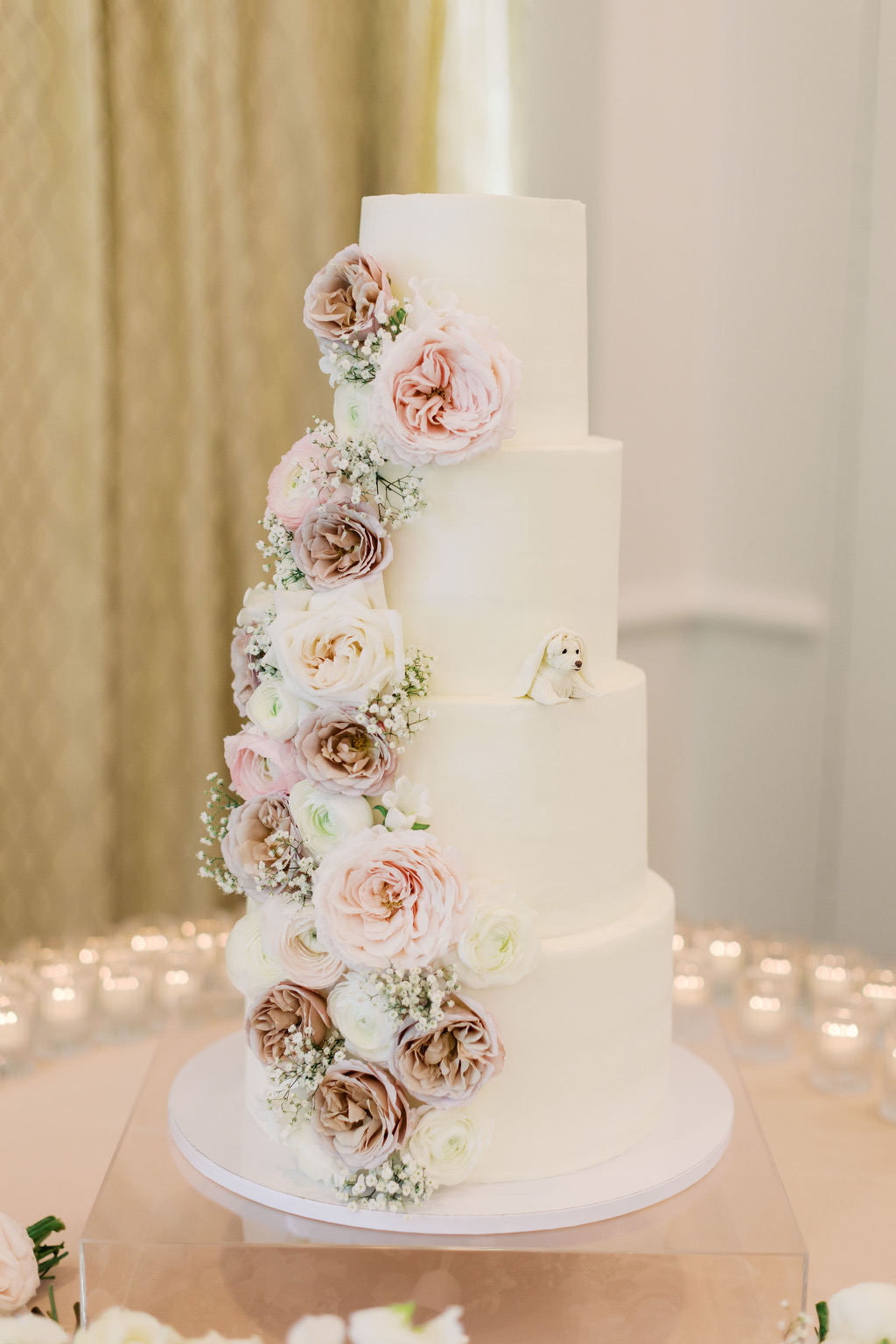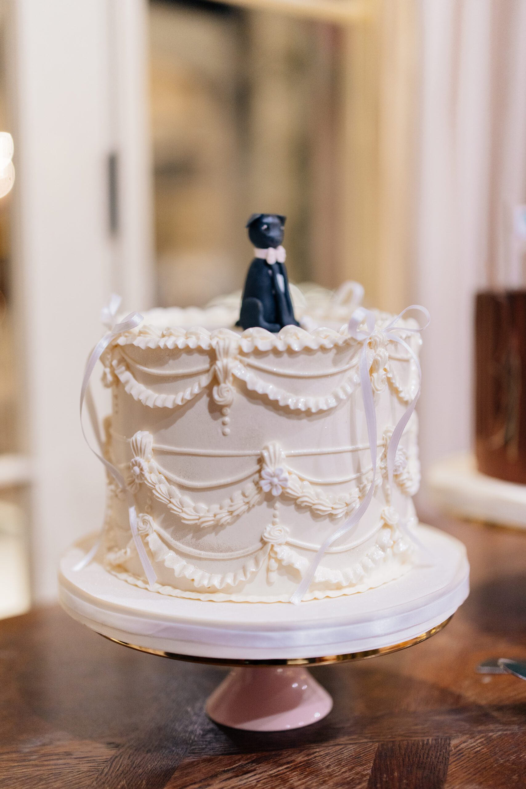 Nikki Vu and Drew Gallman also brought their dog into their big day through cake. Peeking out of the third tier of the couple’s wedding cake by Tredici Bakery is pup Suki.