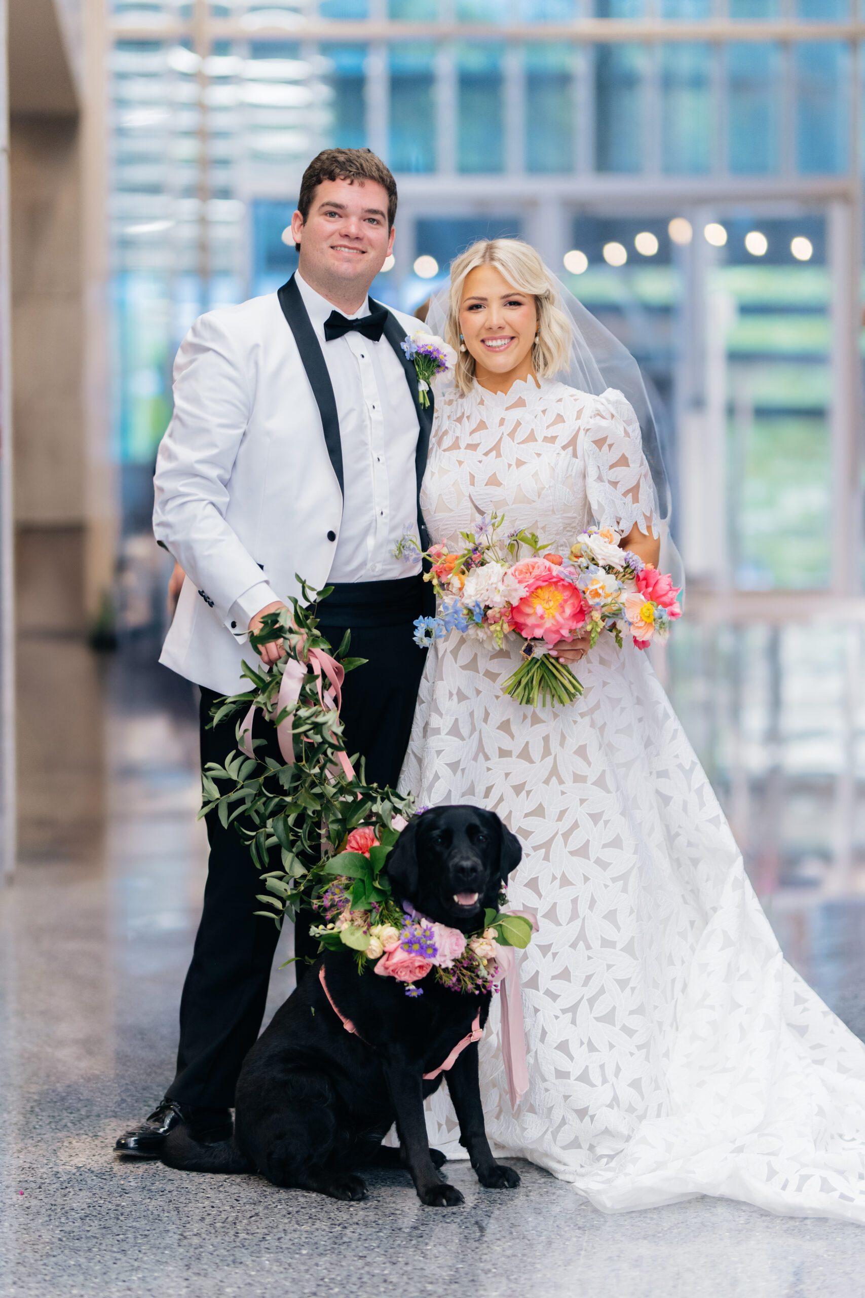 Camille Gianfala and Paul Murrill’s dog made it to the ceremony. The couple’s black lab Winnie not only posed for portraits but also made her way down the aisle with the wedding party–complete with a floral-embellished leash and collar.