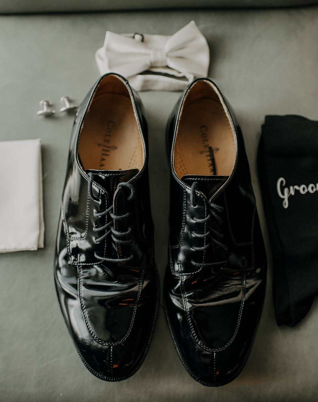 “Tell them not to get dressed until the photographer gets there,” she says. “Have their cufflinks, shoes, special socks–this year, a big thing has been underwear with the bride’s face–have all of that ready to go. That way, the groom, groomsmen and the photographer know what to do and can get those great, relaxed shots.”