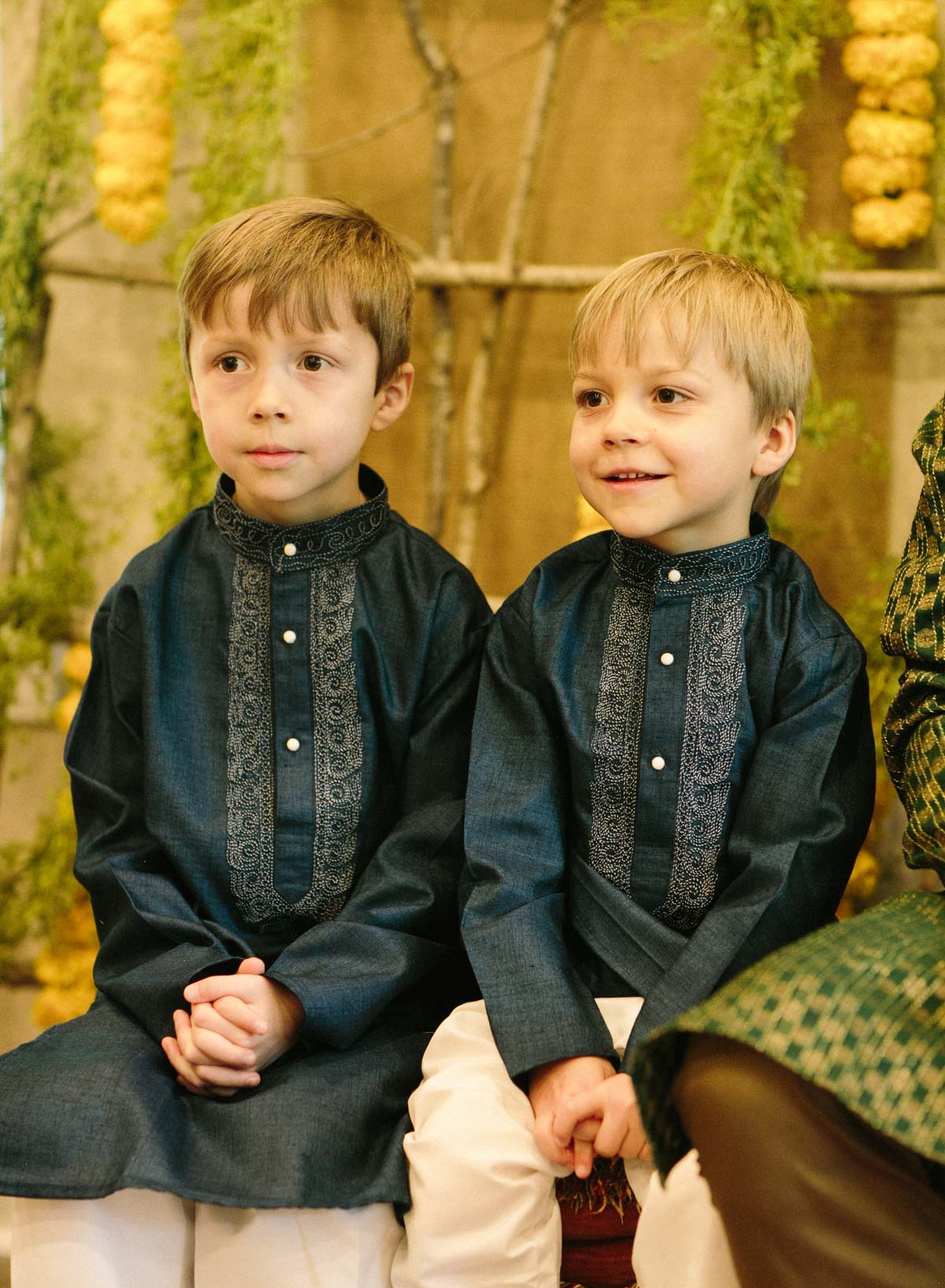 The ceremony itself was performed in Sanskrit, the world’s oldest surviving classical language, and included rituals based on centuries-old traditions. Meghana entered the mandap holding a coconut, a symbol of prosperity. The couple began the ceremony separated by a curtain; their hands were placed together beneath the curtain, and they placed a mixture of crushed cumin seeds and brown sugar on each other’s heads to signify that they would be inseparable through bitter and sweet times. Later, friends and family members showered blessings on the couple with flowers and rice. The ceremony ended after J.W. and Meghana took seven steps and with each step took a vow.