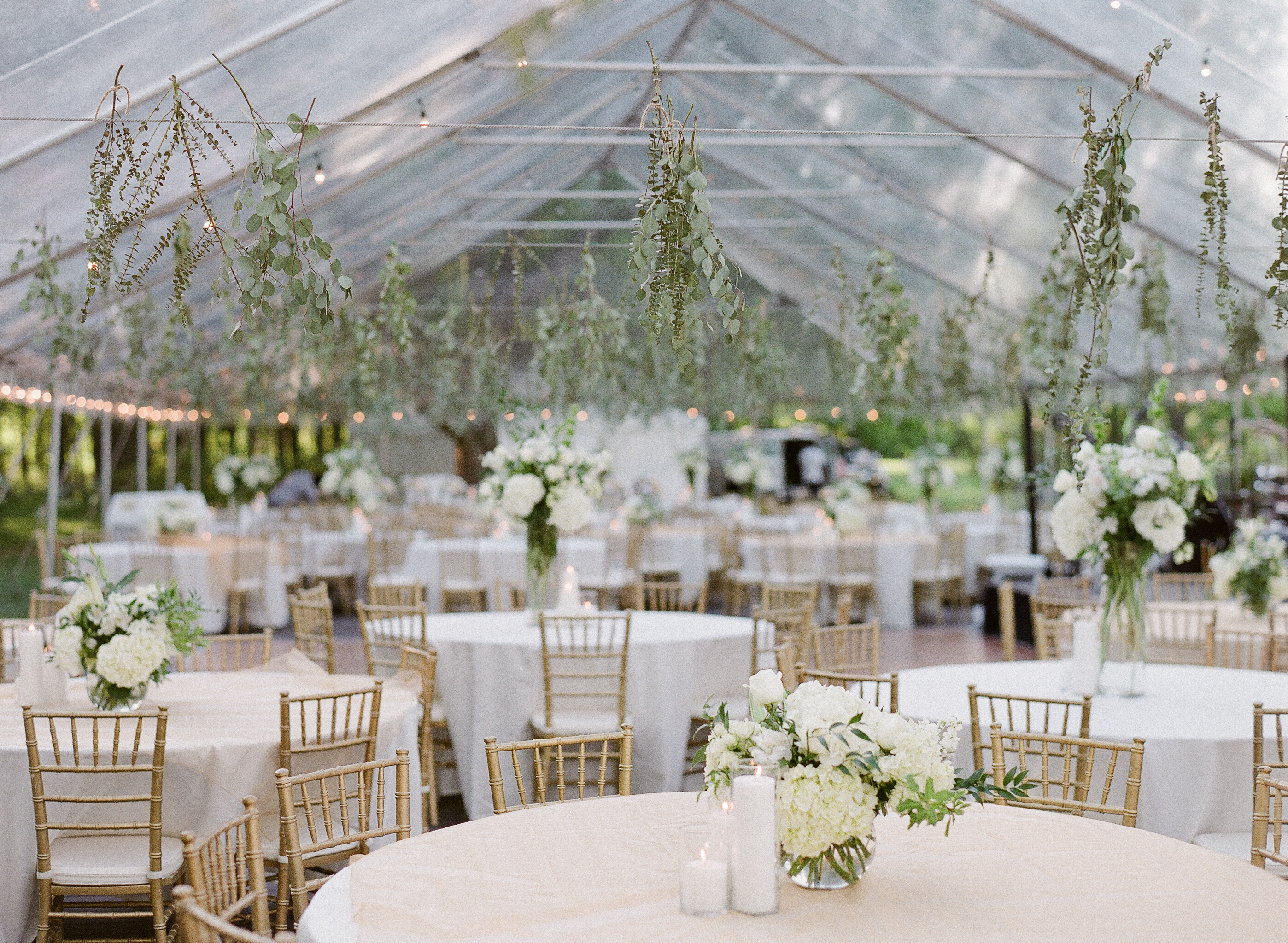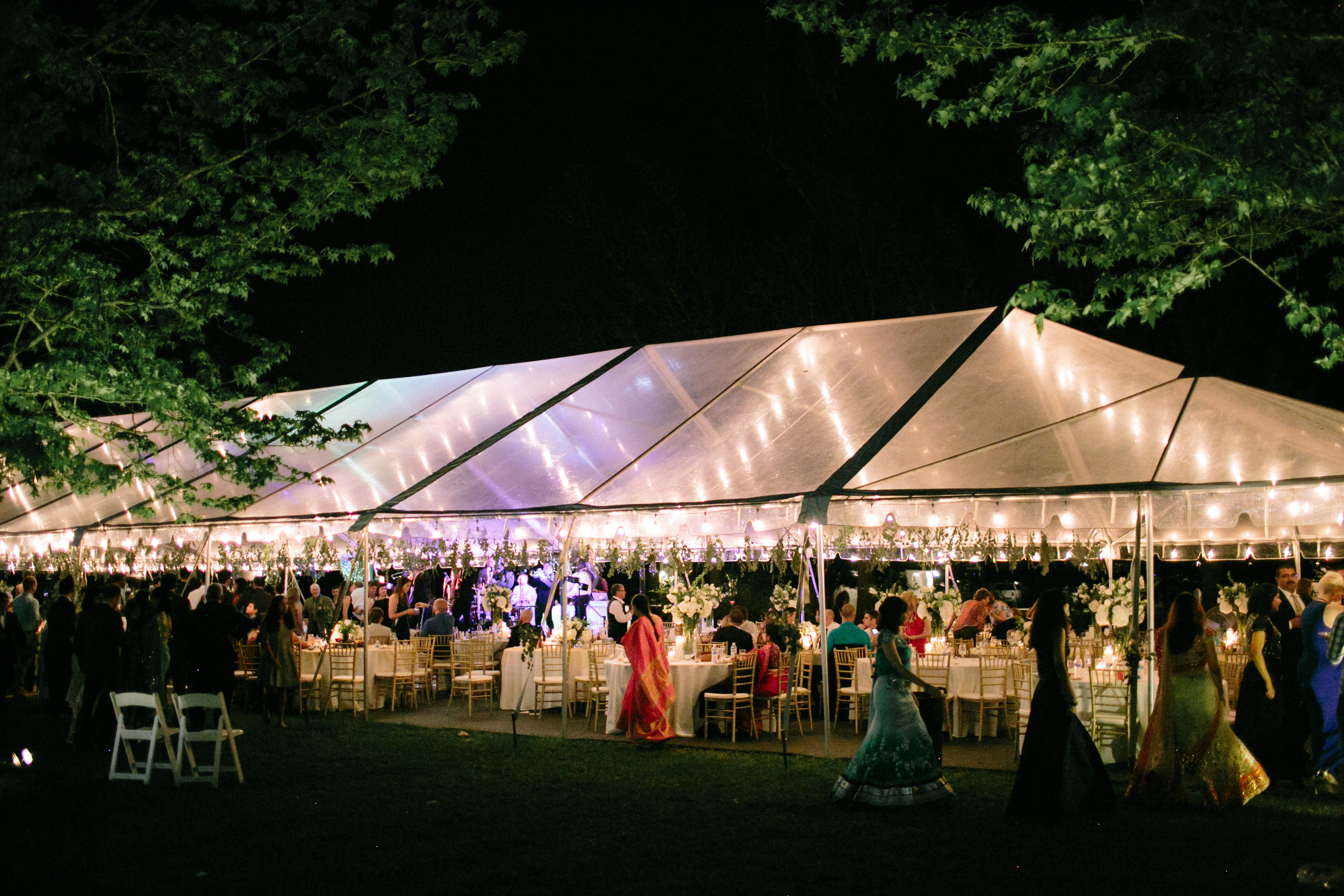 The reception was held under a clear tent filled with white flowers and candles. Guests enjoyed savory dishes catered by Bay Leaf Indian Cuisine and desserts flown in from India, and they danced to the music of the Michael Foster Project. “I wanted our guests to have a pleasant evening under the stars,” says Meghana.