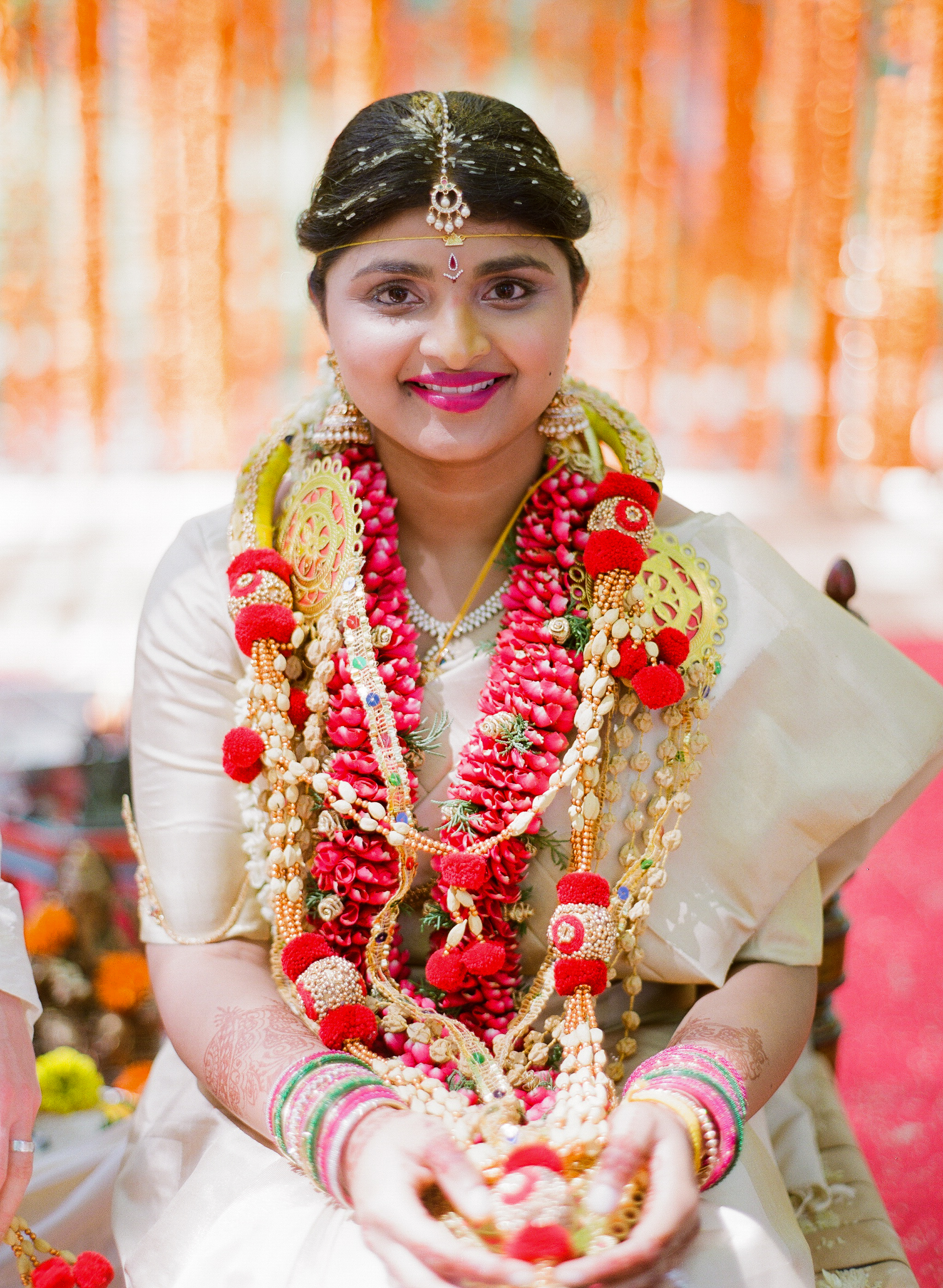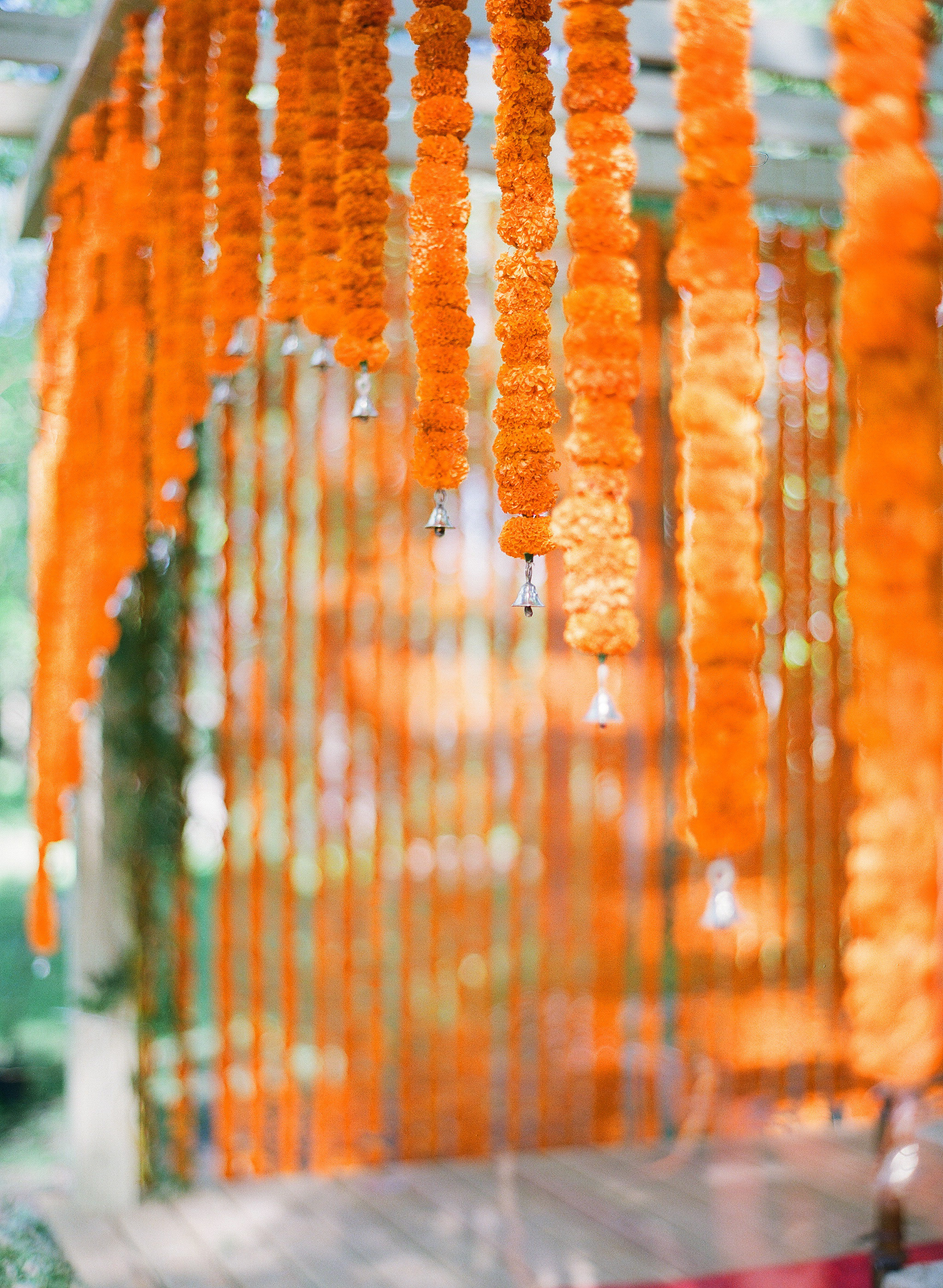 The décor for the day featured vibrant colors for the ceremony, followed by a serene white setting for the reception. “Marigolds are a very popular flower in India and are used for the most auspicious occasions, but they’re very rarely seen here,” Meghana says. “So I had this vision of strung-up marigolds hanging from my mandap as I married J.W. under the trees. It sounded so simple in my head, but I learned later how hard it would be to execute! It was absolutely magical and so worth it.”