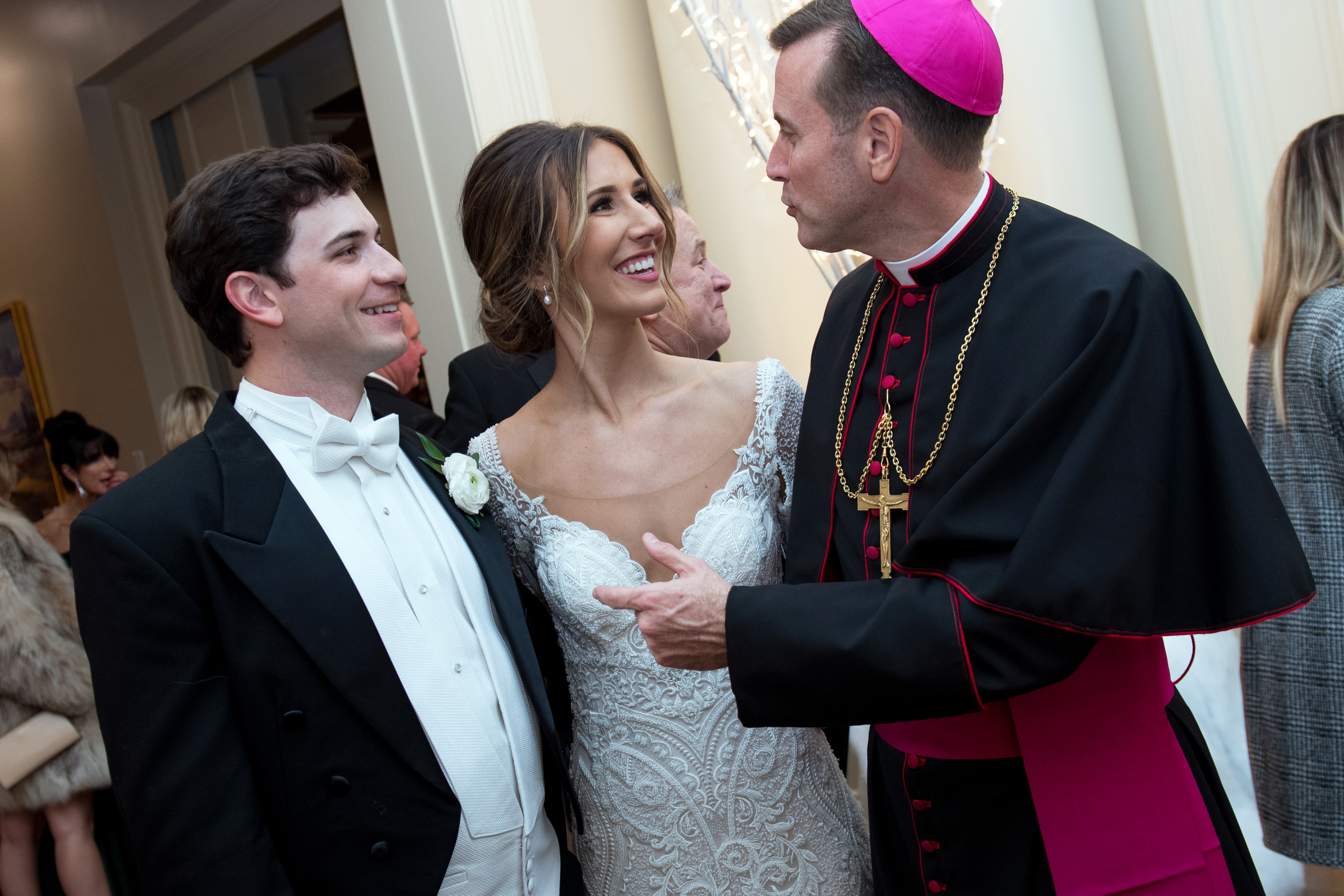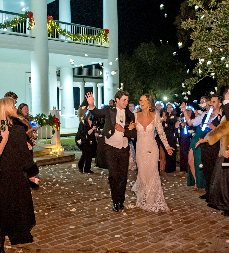 On the evening of the ceremony, Christmas trees glittered against the white-and-black palette of the wedding party’s attire, and the cake at the Country Club of Louisiana reception mimicked the black-and-gold elegance of the wedding invitations. All of these little details proved that a consistent theme is a classic condition for outdoing the ordinary, even in the midst of so much welcome familiarity.