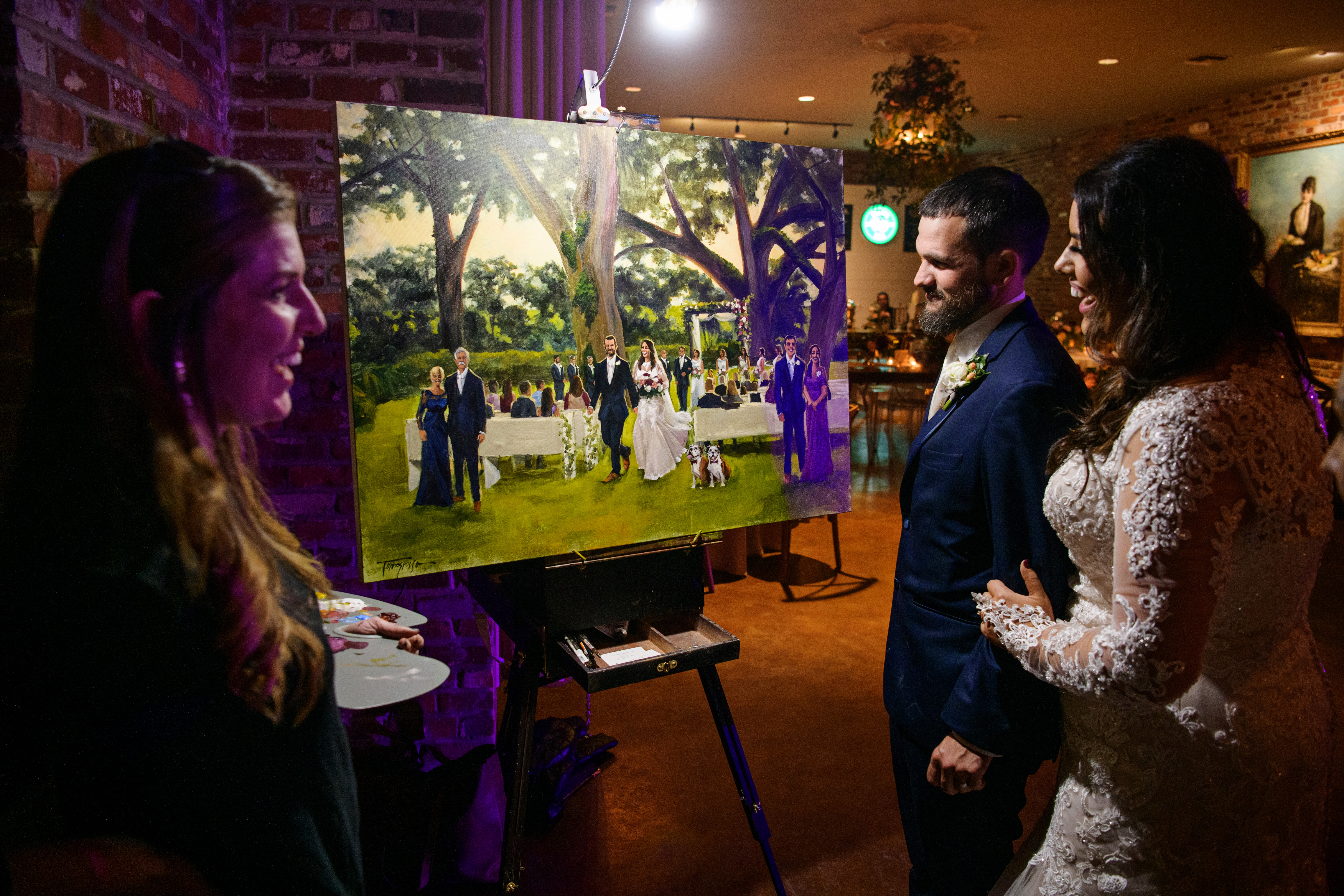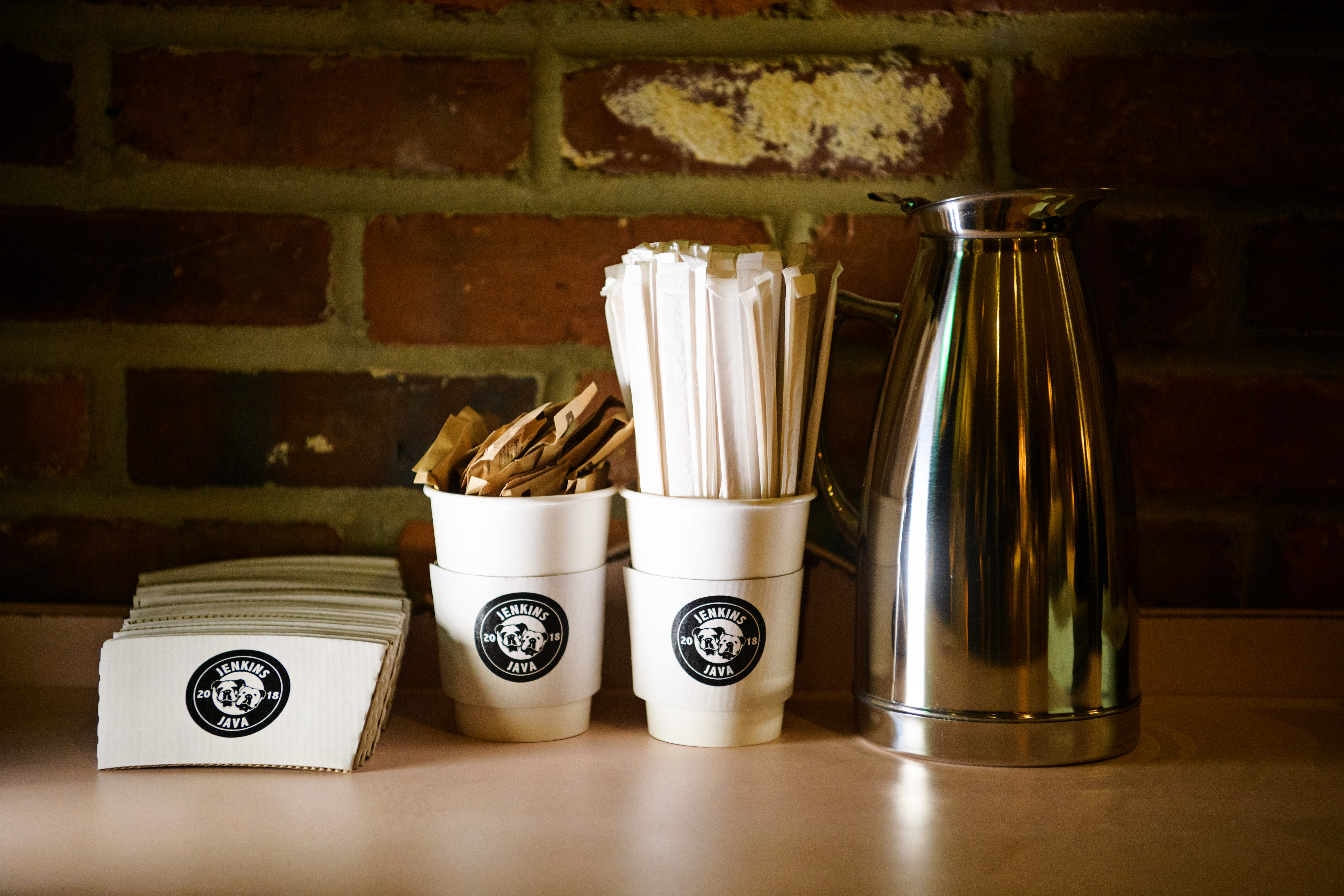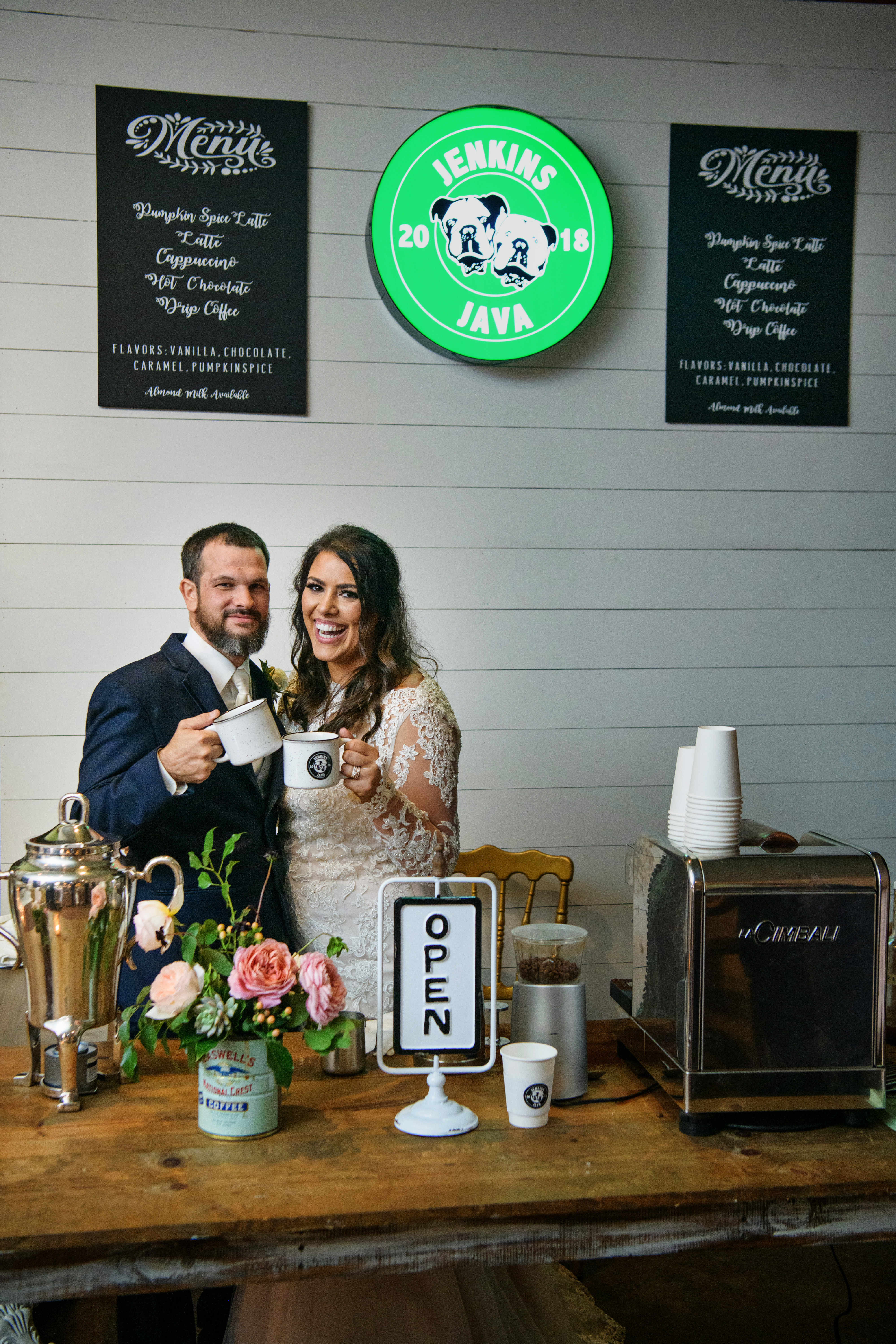 “It was important to us that every detail reflected who we are as individuals and as a couple,” she notes. “I’m a self diagnosed coffee addict, and his favorite food group is french fries, so we incorporated both of those details right away. That is how Jenkins Java was born. Our own little coffee shop at our wedding reception was complete with baristas, a full menu of espresso and coffee drinks and a sign made by the groom and his brother. The sign’s design was a version of my favorite coffee shop’s logo, but included our fur babies at the center.”