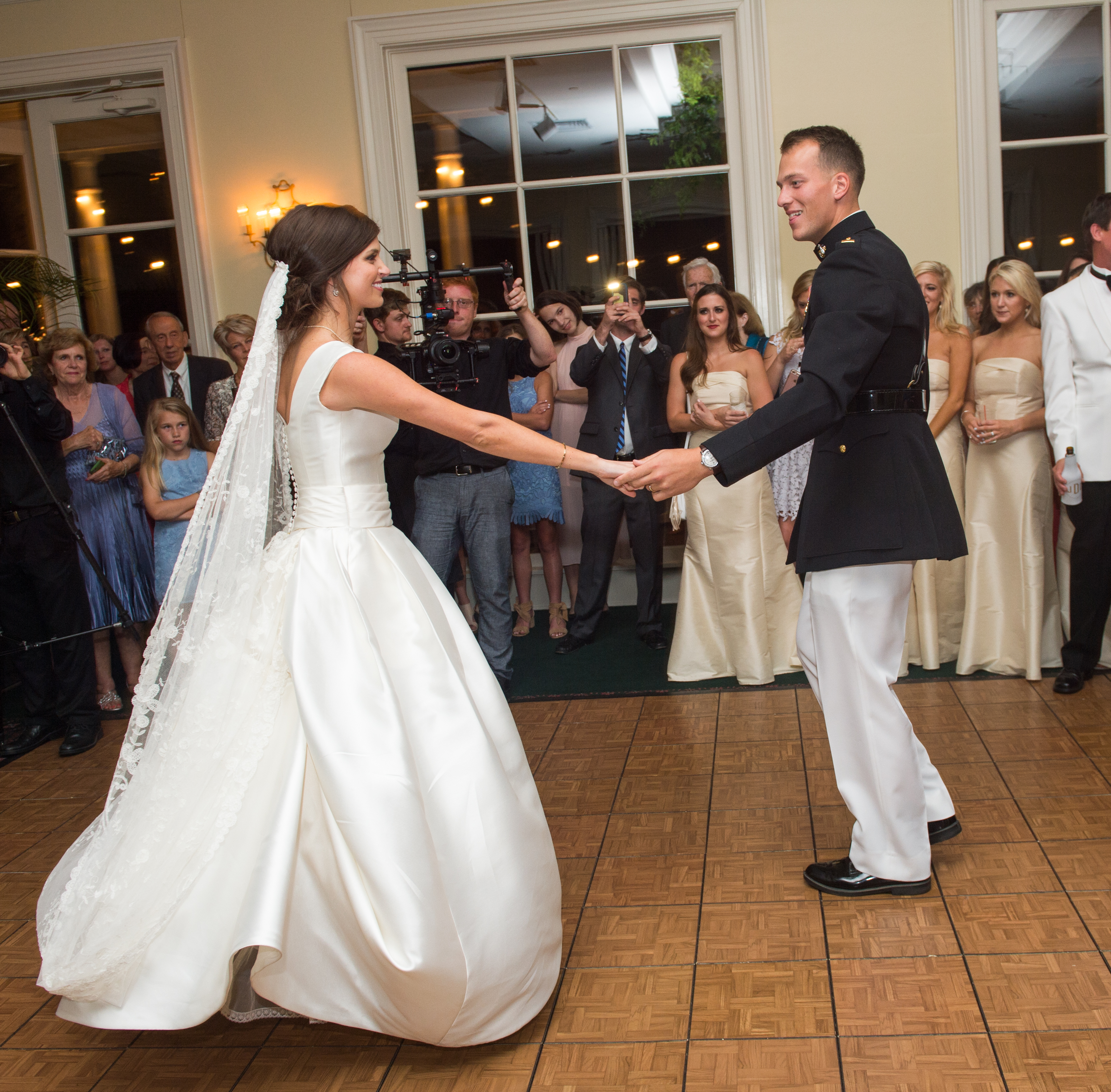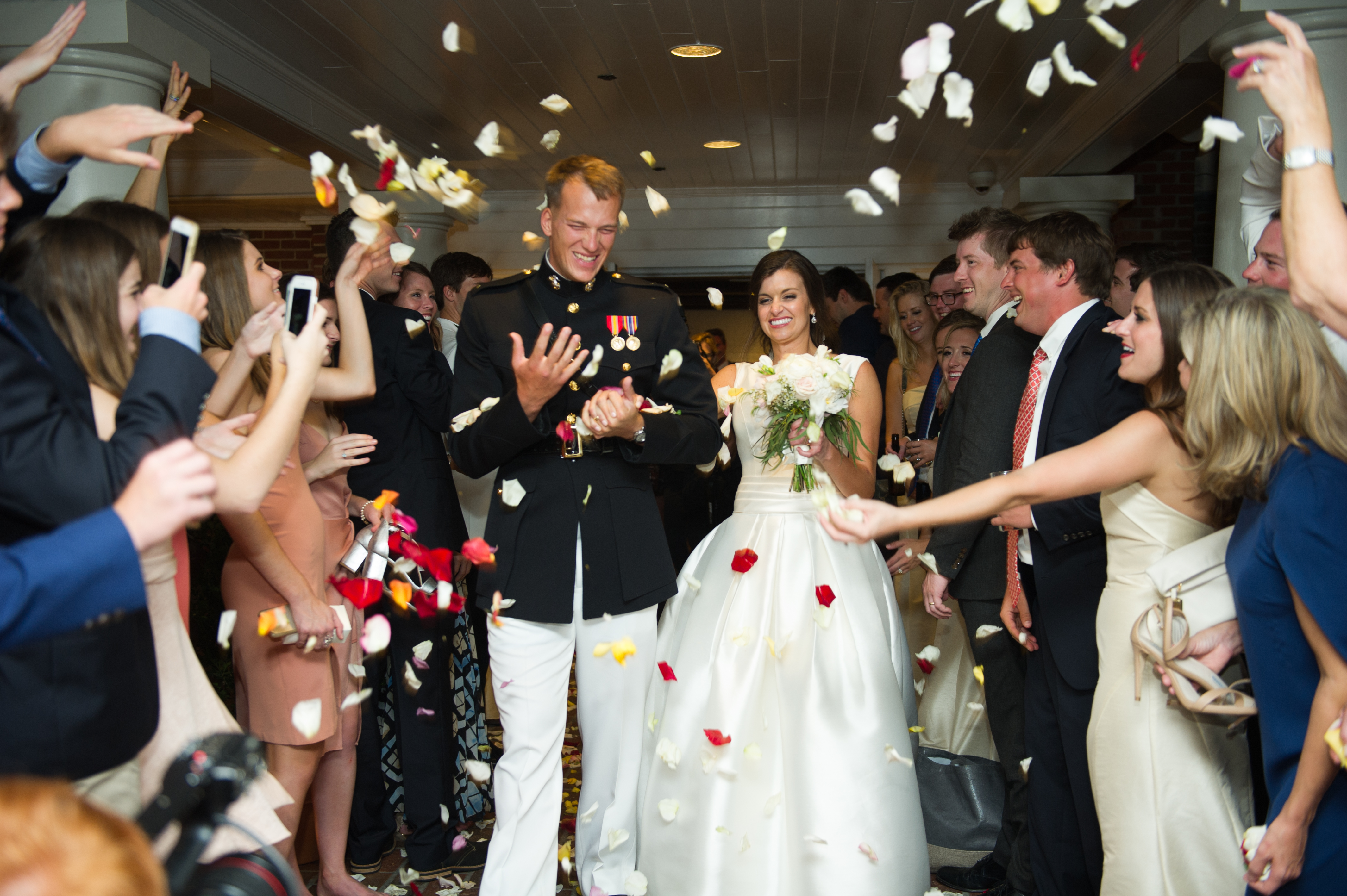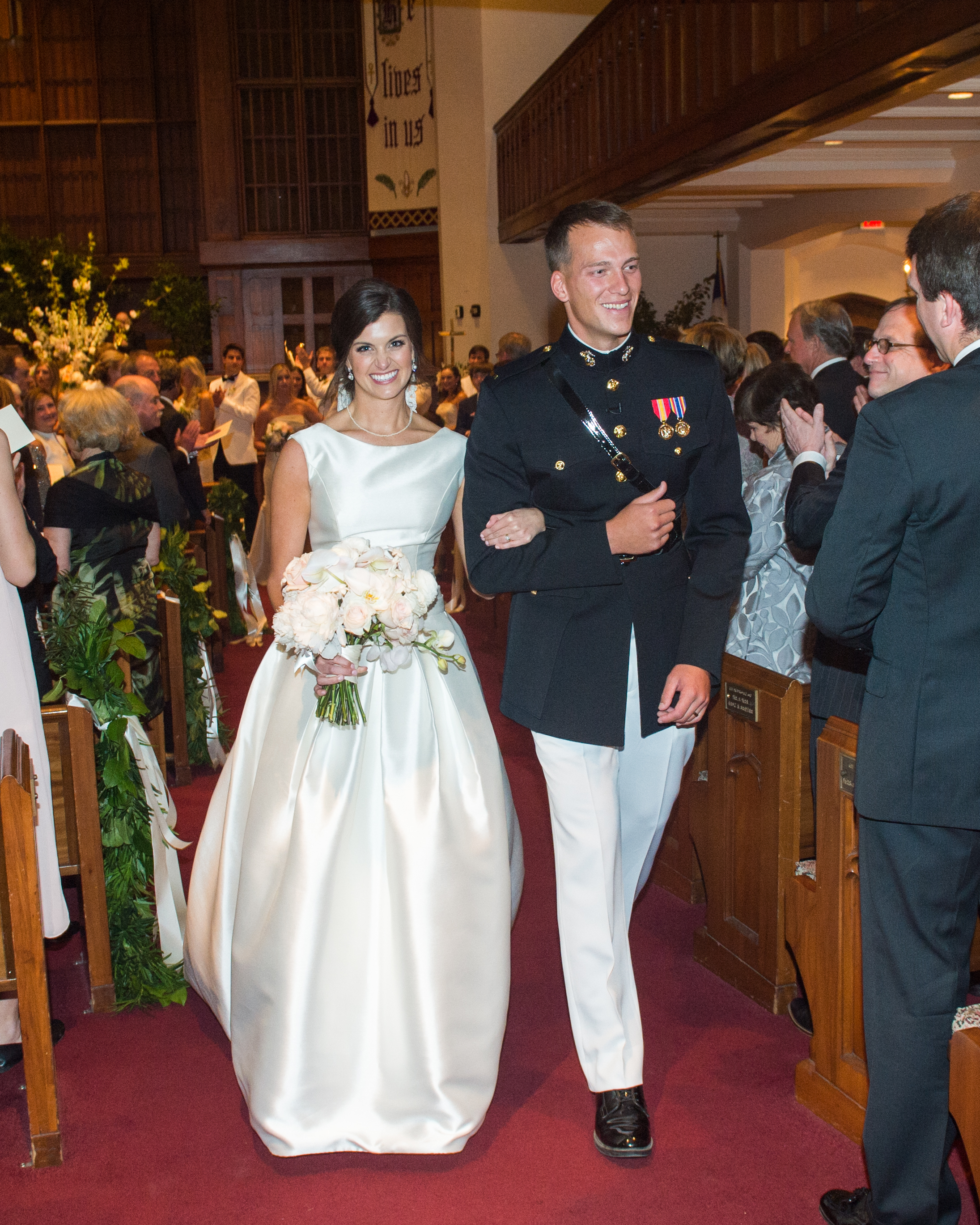 “Our closing hymn was ‘Let There Be Peace On Earth,’ which obviously has a special meaning to us and our families,” she says. “I moved to California the morning after our wedding, so our reception was kind of a send-off for us both, with the Marine anthem closing out the party. He returned from his deployment about a month after our one-year wedding anniversary, and thanks to my mom and Fedex, we were still able to enjoy our cake topper!”