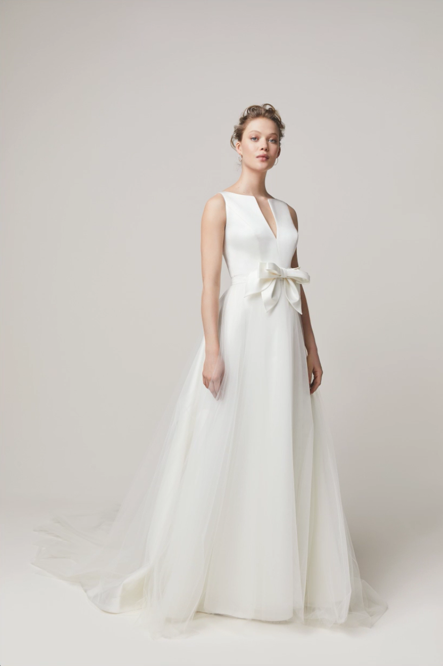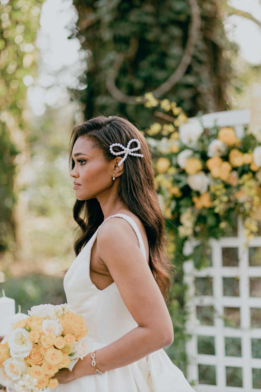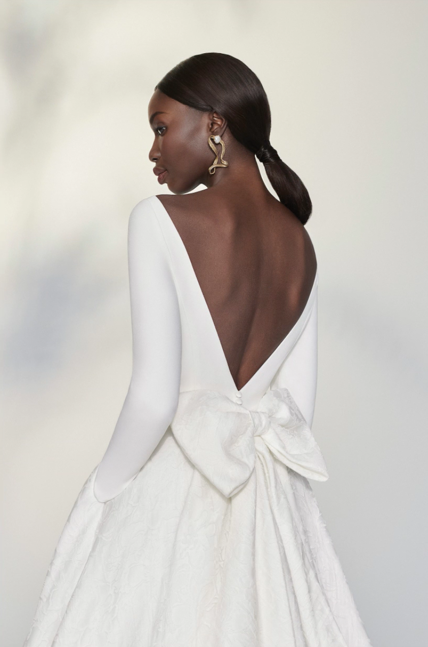 “A lot of people start out as little girls wearing bows in their hair—’no bow, no go,’ I used to say,” says Sims. “But I love seeing brides choose subtle bow details that surprise their mothers who couldn’t have put a bow in their daughters’ hair if they tried. It’s just a classic detail that isn’t going away anytime soon.”