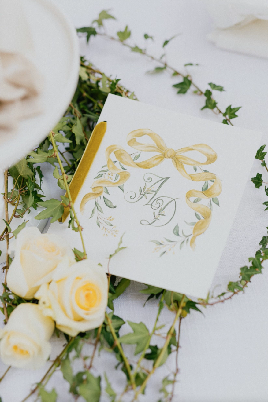“I was inspired by the straw bag trend for this shoot, and I thought the bow detail you see on the one we used was a cute way to bring in the trend while still keeping the style looking different and individual,” says Babin. “Even the monogram on the stationery is a very Southern-inspired touch, but the bow detail is an unexpected embellishment to just make it extra pretty.”
