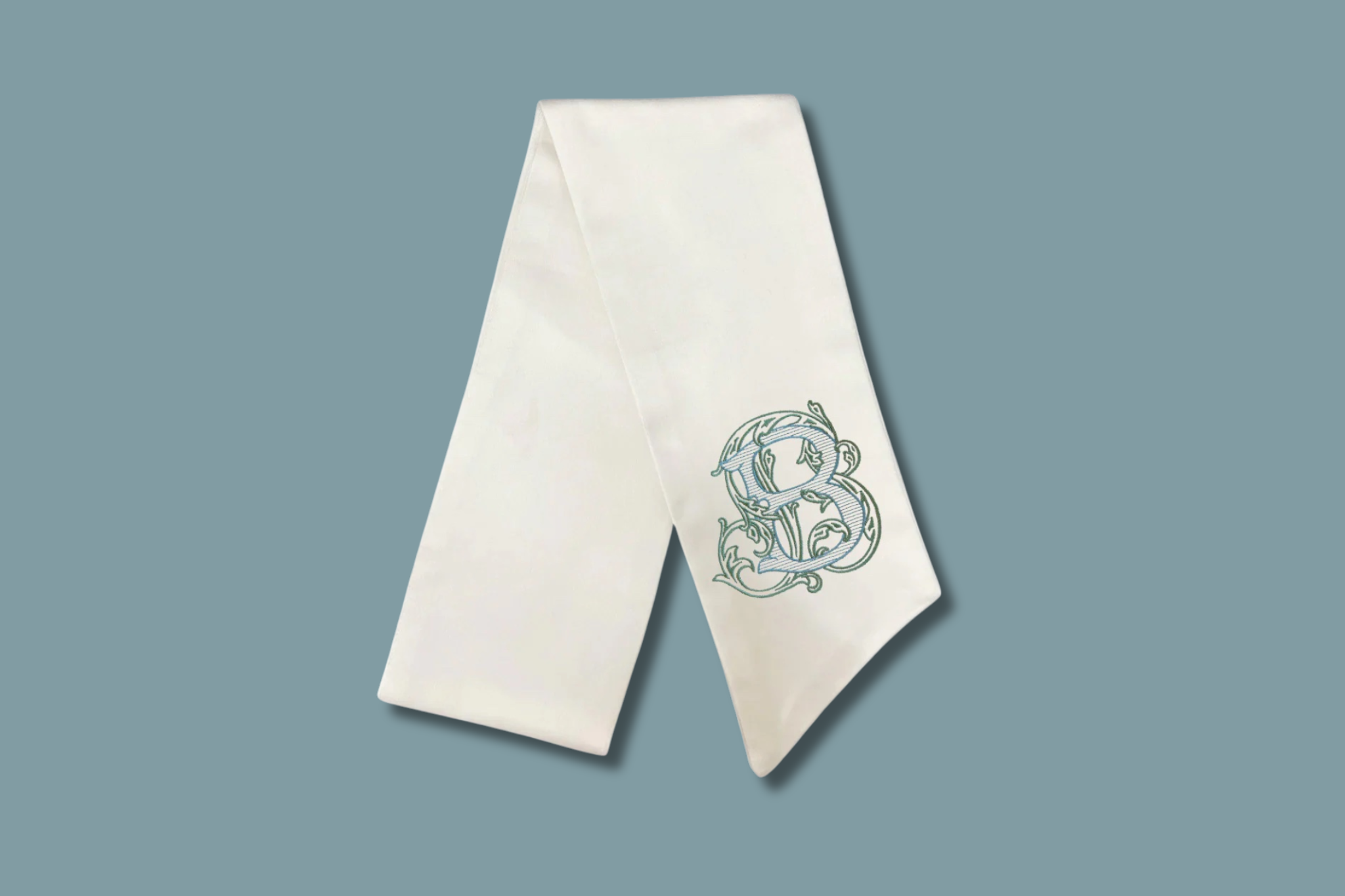 On a bridal bouquet, the monogrammed sash is a sophisticated final touch. Brides can customize them with their initials, new last name or family crest. Following the “I dos,” the sash becomes a thoughtful addition to the newlyweds’ home, creating a keepsake for them to display for years to come.