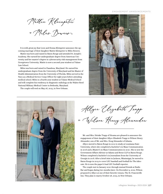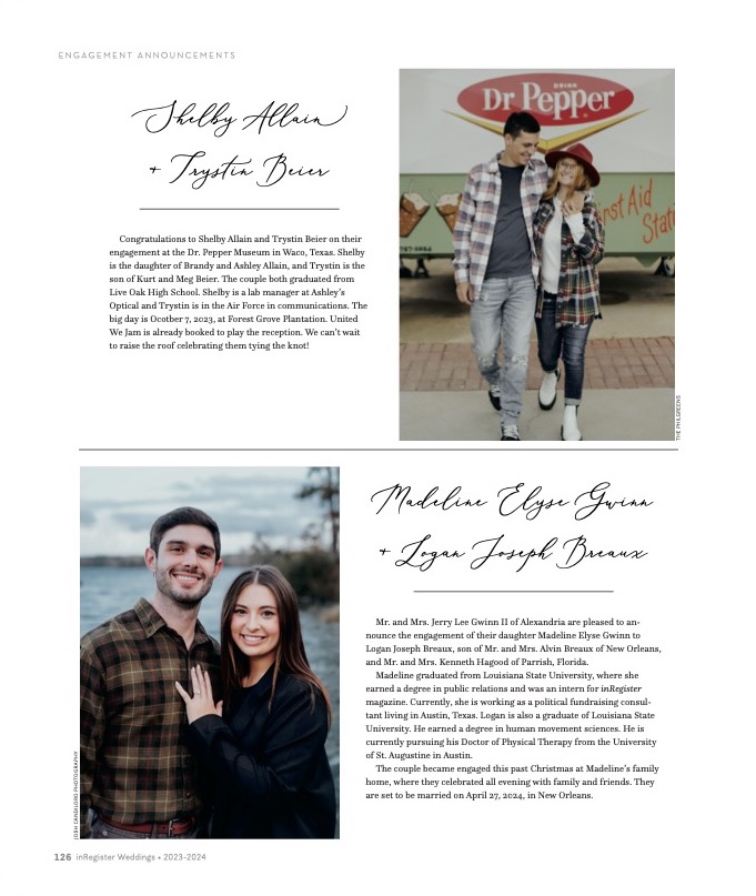 A Paid Engagement Announcement lets newly engaged couples share their happy news with the Baton Rouge community. Each half-page announcement includes one vertical photo and a short write-up.