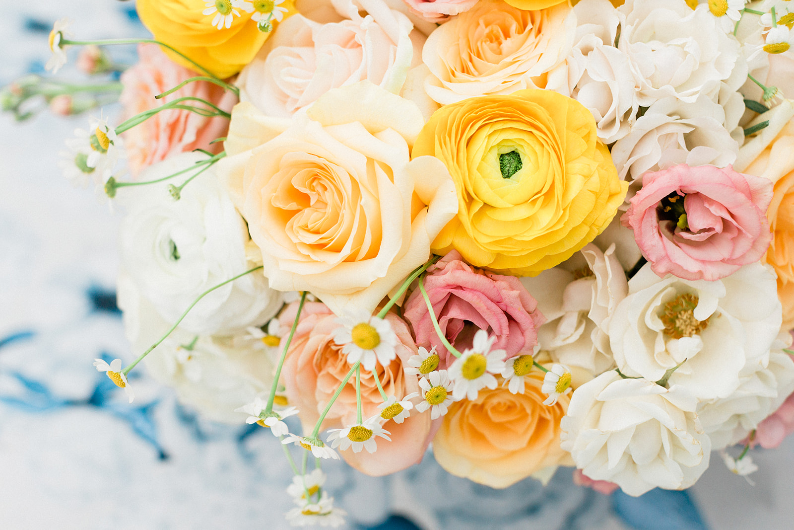 Any season in south Louisiana is a good season to get married. We turned to Angela DiVincenti Babin of Angela Marie Events to take us through the year with inspirational florals and settings for bridal events and beyond. Since chinoiserie is a timeless classic, Babin chose a blue and white watercolor-style tablecloth in a chinoiserie motif for this summer seating. It acts as a neutral from which the citrus-hued flower arrangement pops. A gauzy napkin knots casually over the formal plates.