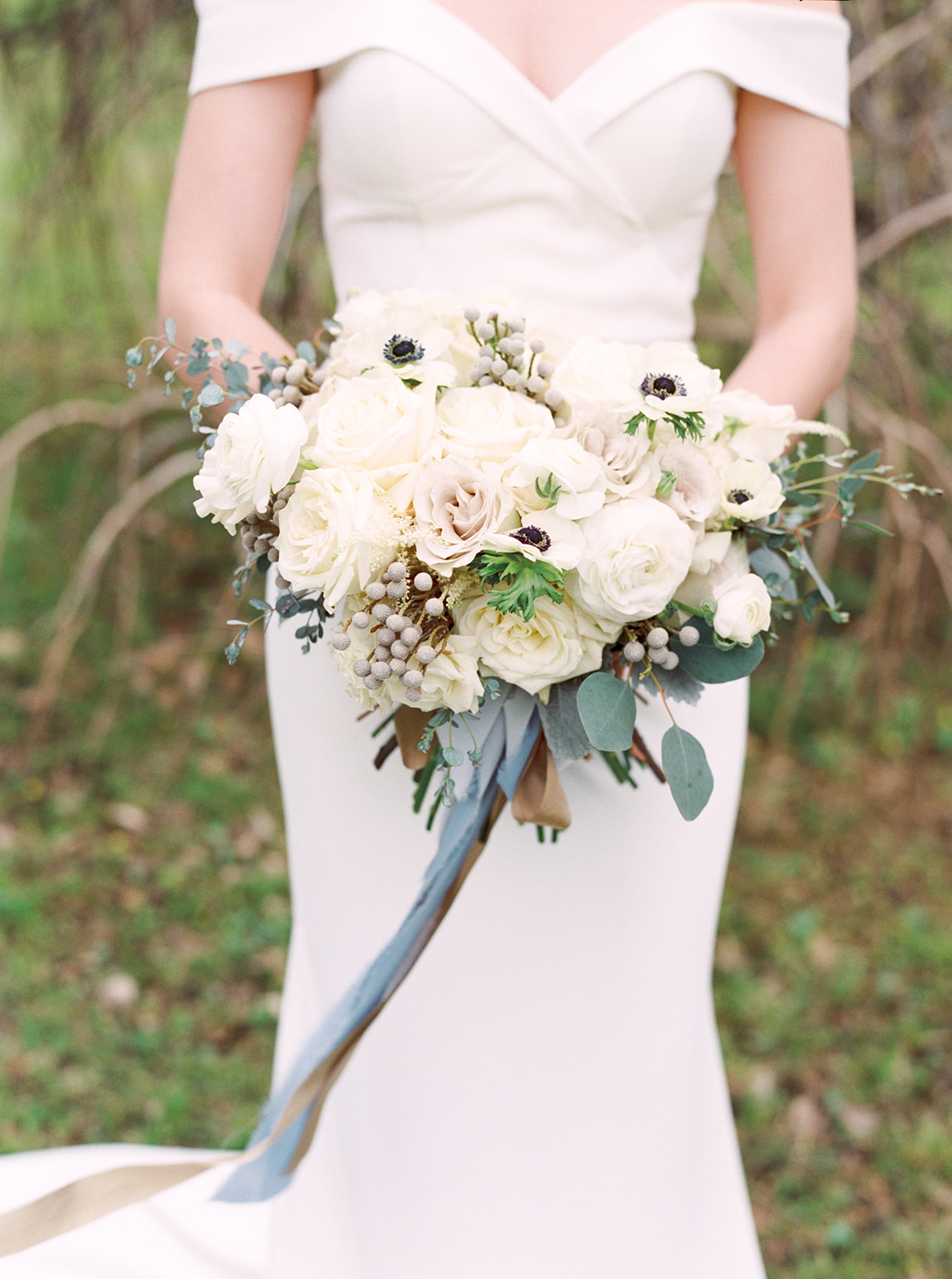 White florals abound during the winter months, when brides turn to soft, subtle color to reflect the chilly weather. But that doesn’t mean color doesn’t have its place. Babin introduced a cobalt blue plate (in keeping with the Pantone color of the year) to add sophistication and regal elegance to the simple scene. But gray, neutral tableware can also be used to create a subtle scene.